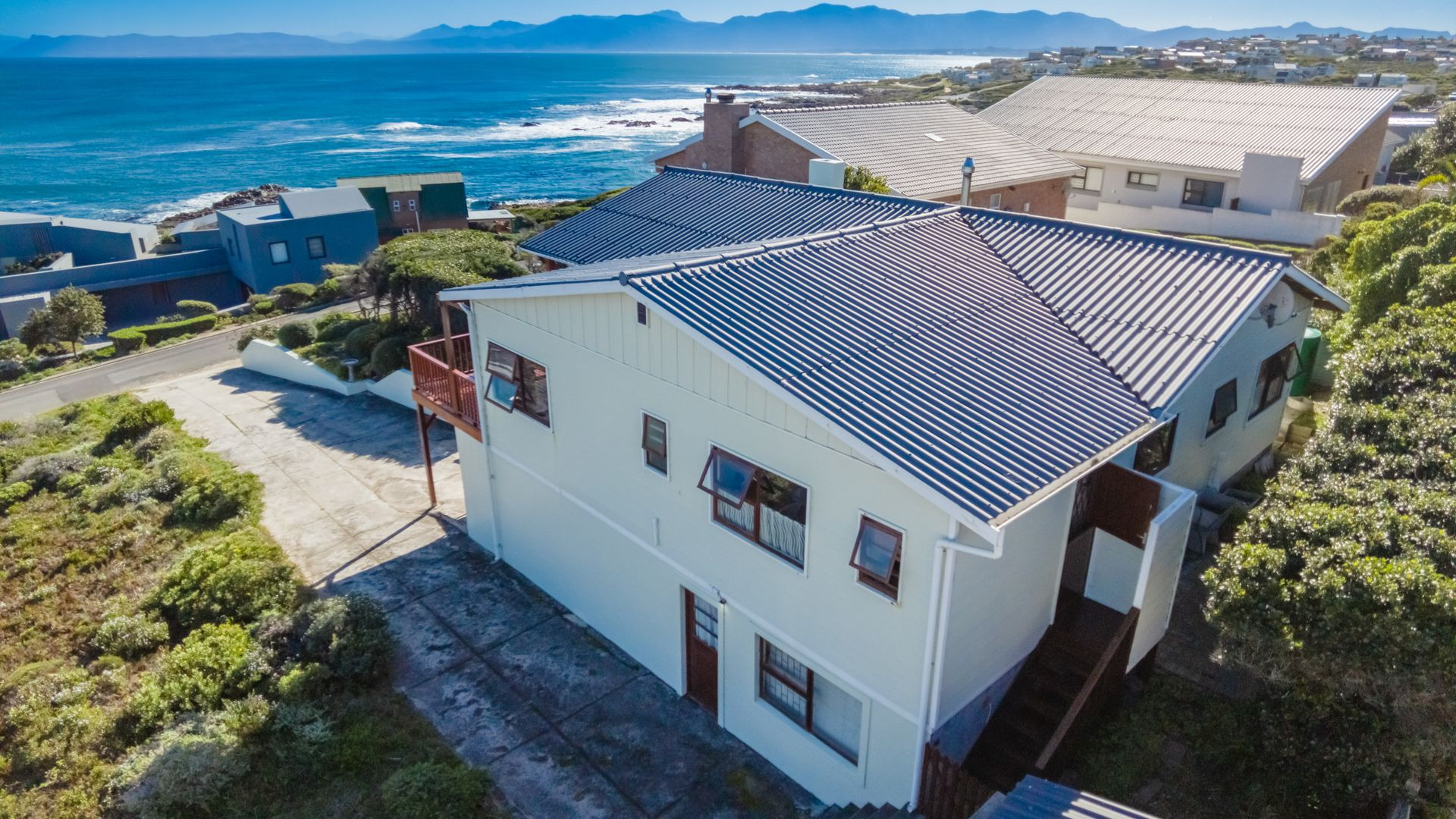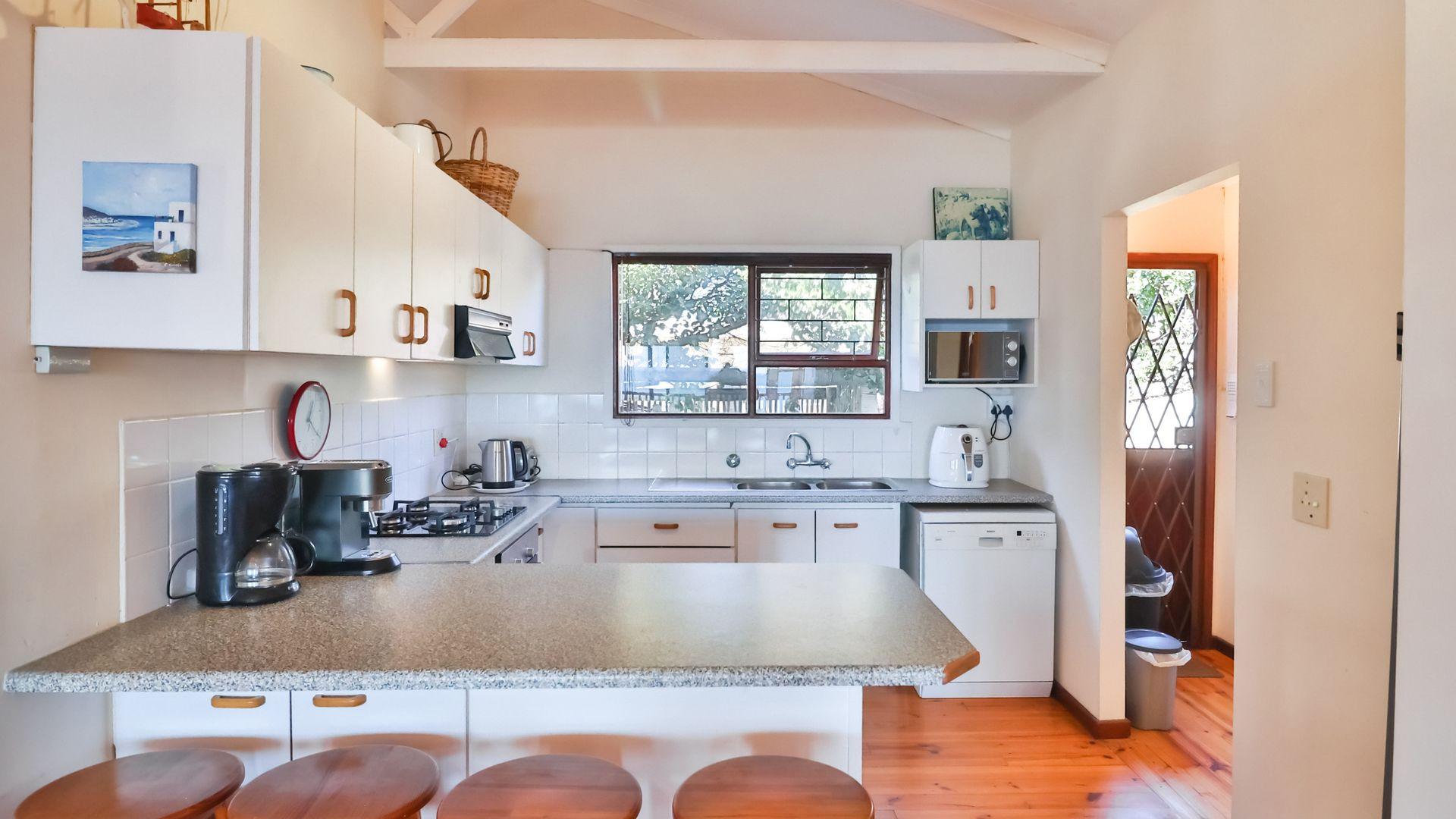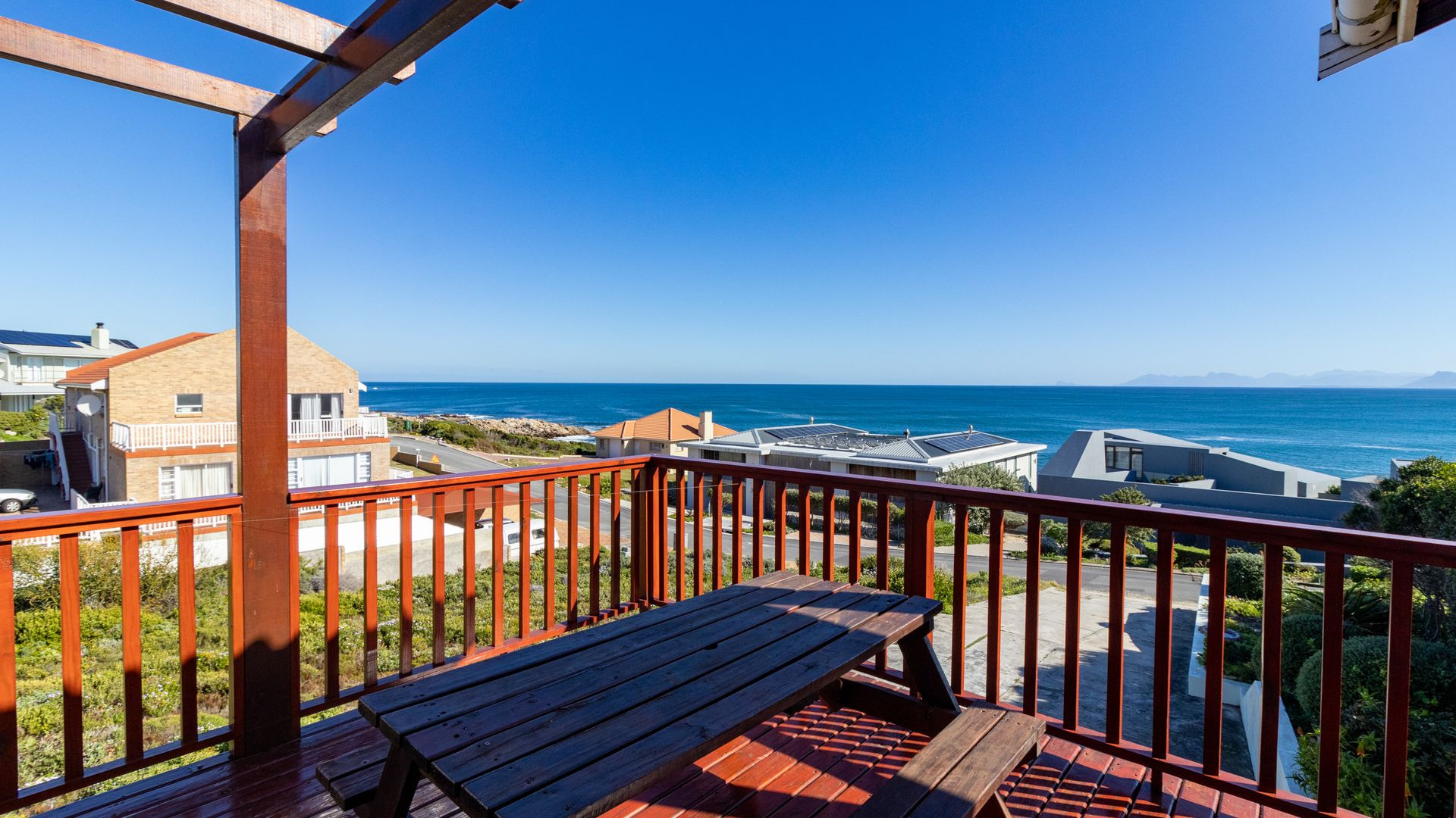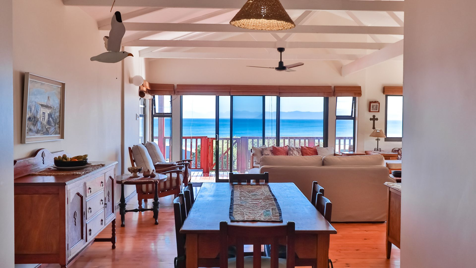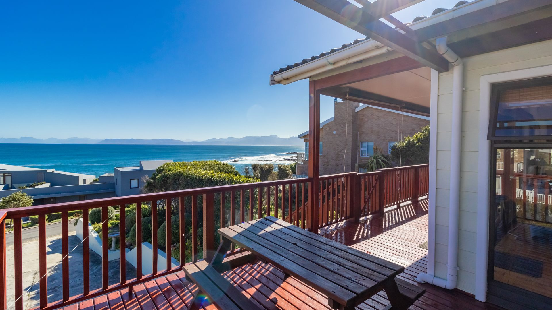 From the wooden deck, you are welcomed into the living area which, in addition to celebrating the light and sight of the sea, features a close-combustion fireplace and ample space for indoor gatherings around the table. A modern, open-plan kitchen (with adjoining pantry) opens out to the garden, which includes a Wendy house and a shaded courtyard for outdoor entertaining. Sharing the balcony, the master bedroom offers an en-suite bathroom, while a second full bathroom is shared by two more charmingly styled bedrooms. Completing the interior is a home office (perfect for a home-schooler or work-from-home family member). There is so much to love about this home, but get in touch today and discover it for yourself.