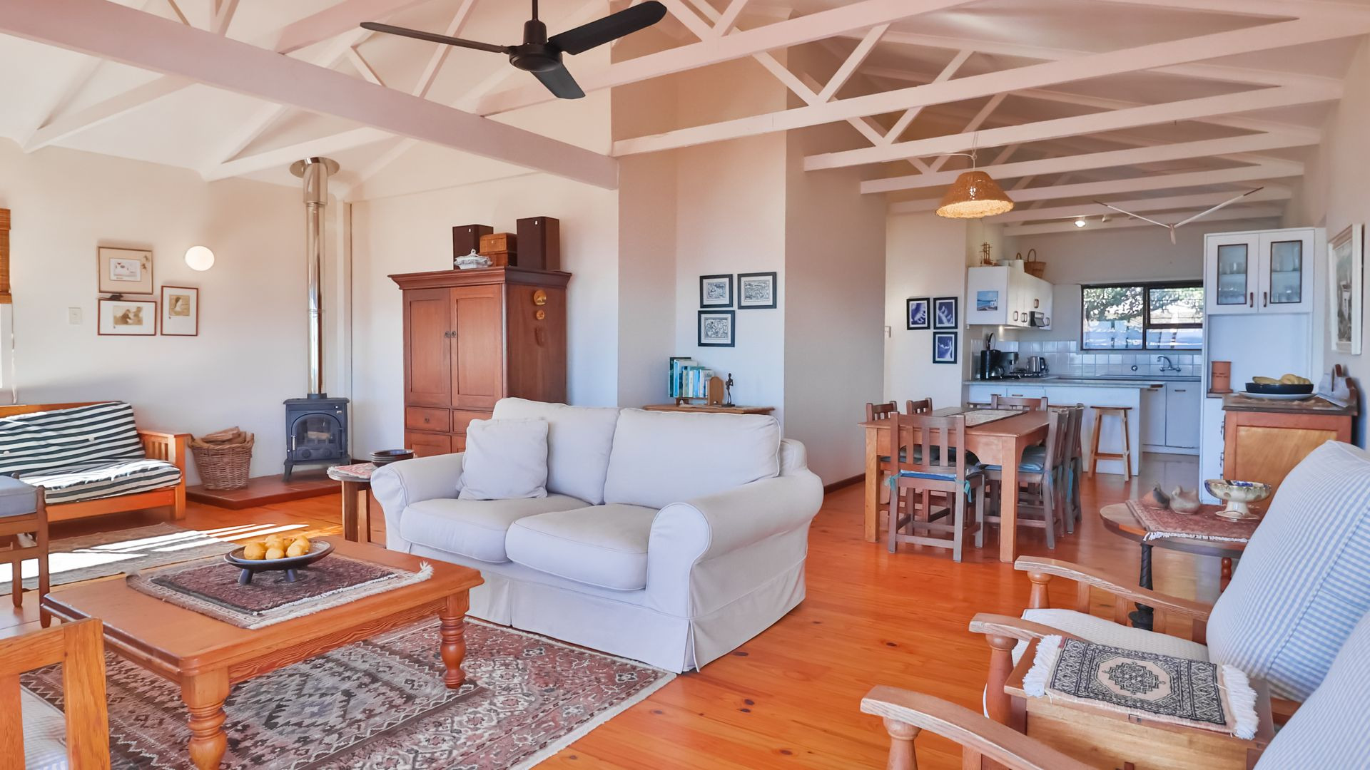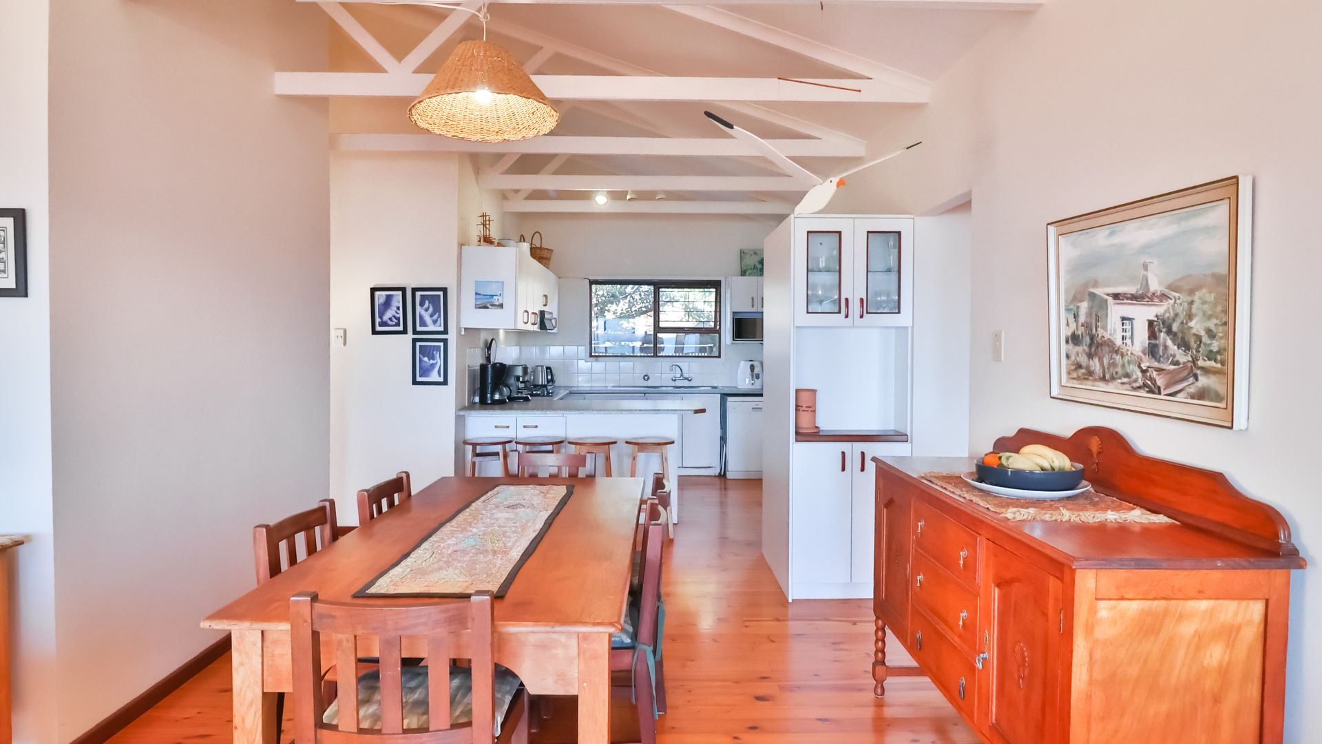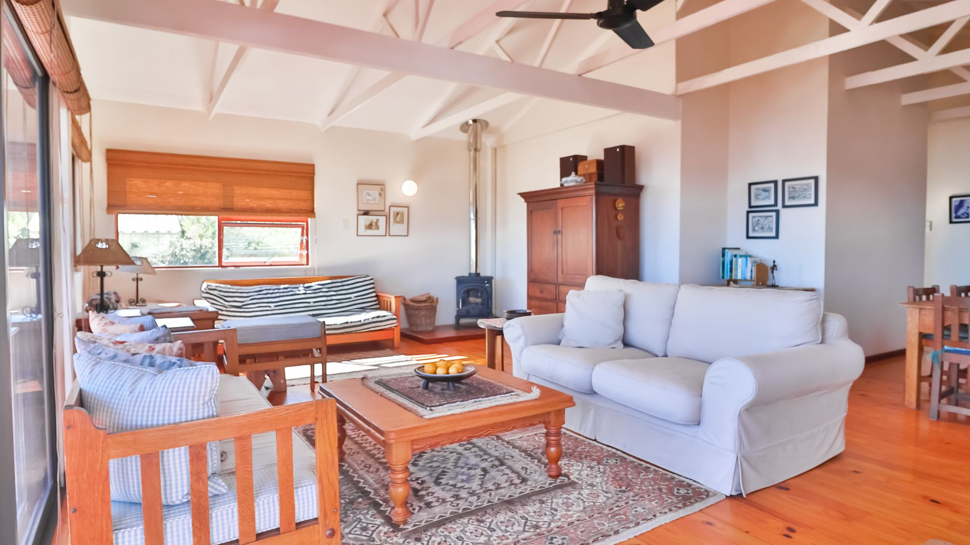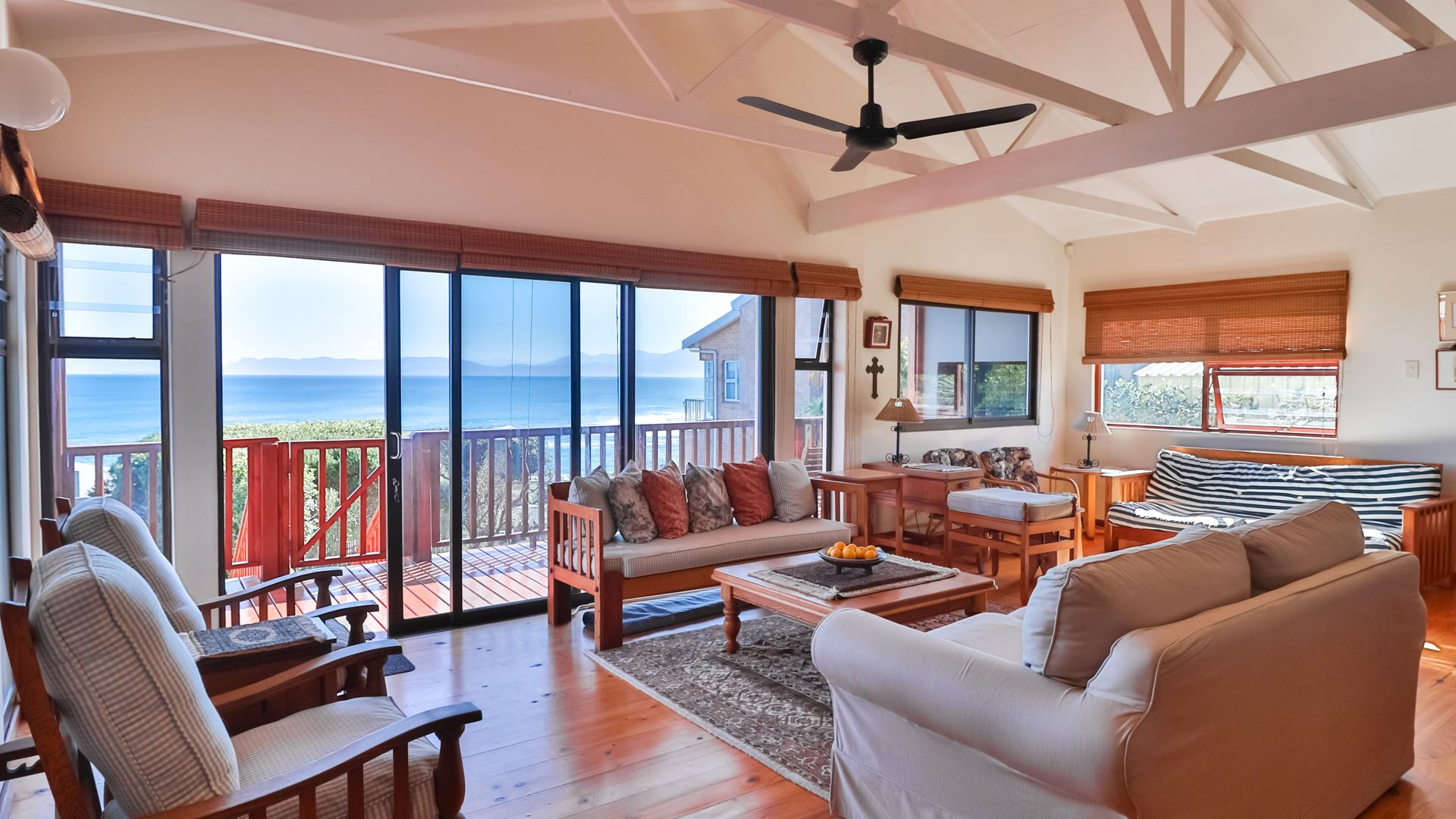 From the wooden deck, you are welcomed into the living area which, in addition to celebrating the light and sight of the sea, features a close-combustion fireplace and ample space for indoor gatherings around the table. A modern, open-plan kitchen (with adjoining pantry) opens out to the garden, which includes a Wendy house and a shaded courtyard for outdoor entertaining. Sharing the balcony, the master bedroom offers an en-suite bathroom, while a second full bathroom is shared by two more charmingly styled bedrooms. Completing the interior is a home office (perfect for a home-schooler or work-from-home family member). There is so much to love about this home, but get in touch today and discover it for yourself.