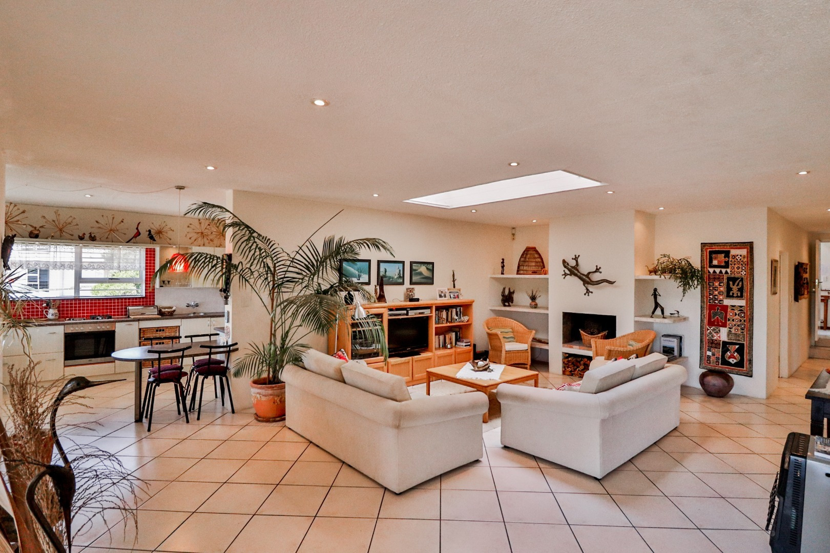 The ground floor is a self-contained 2/3 bedroom dwelling, featuring an extra-large double garage, patio complete with a built-in braai, and a spacious open-plan lounge with a skylight and fireplace, dining room and adjacent modern kitchen, complemented by a generously sized scullery. The master bedroom includes a full en-suite bathroom, alongside an additional bedroom and home-office / study which share a central bathroom. Upstairs, catering to extended family living or functioning as a Guest suite, includes three large bedrooms, each with its private bathroom, seating area, kitchenette, and balcony; showcasing the beautiful views of Walker Bay. Additionally, a second home-office / study and bedroom share a conveniently located bathroom. All first floor furnishings, linens, crockery, and cutlery, as well as five TVs and three bar fridges are included.