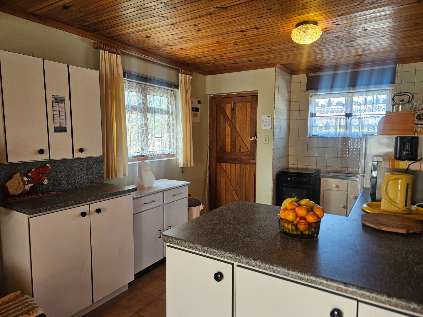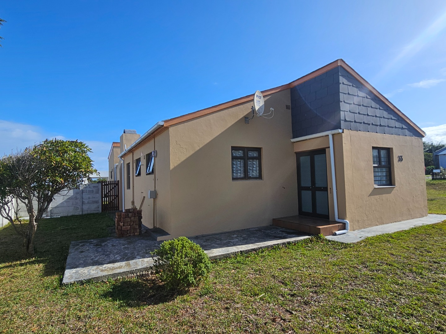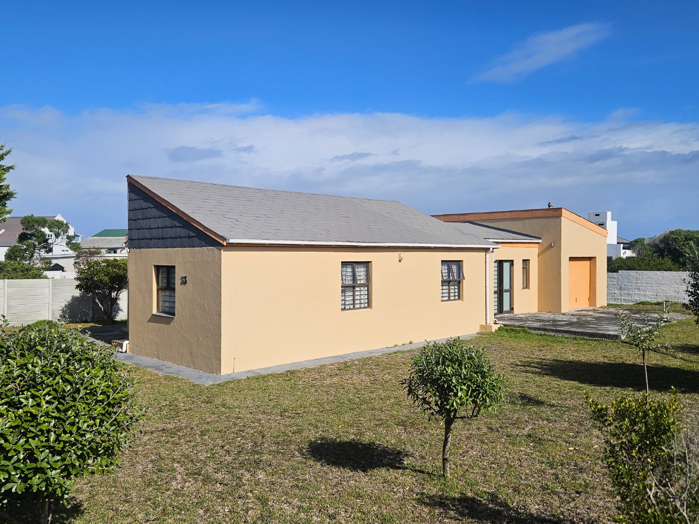 Featuring knotty pine ceilings, aluminium windows, and a braai room, the house includes two bedrooms, two bathrooms, open plan kitchen and living room. Add to this a study that can also be utilised as a third bedroom. The current layout maximises the available space, ensuring that a large family can be comfortably accommodated.