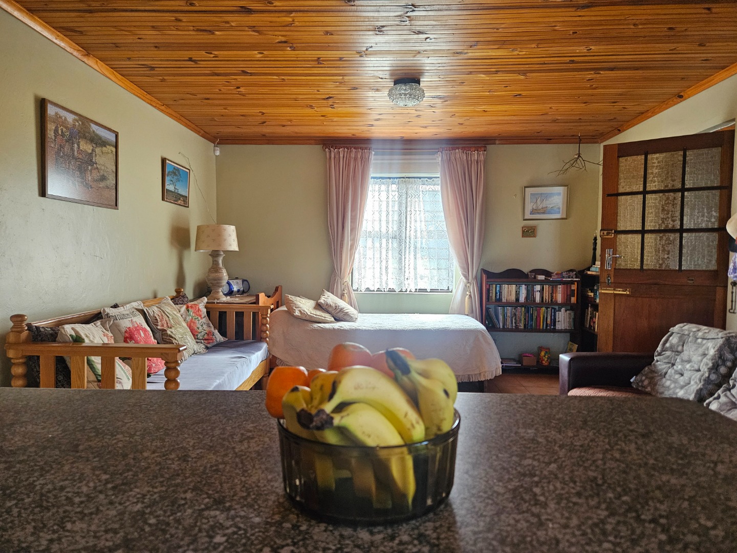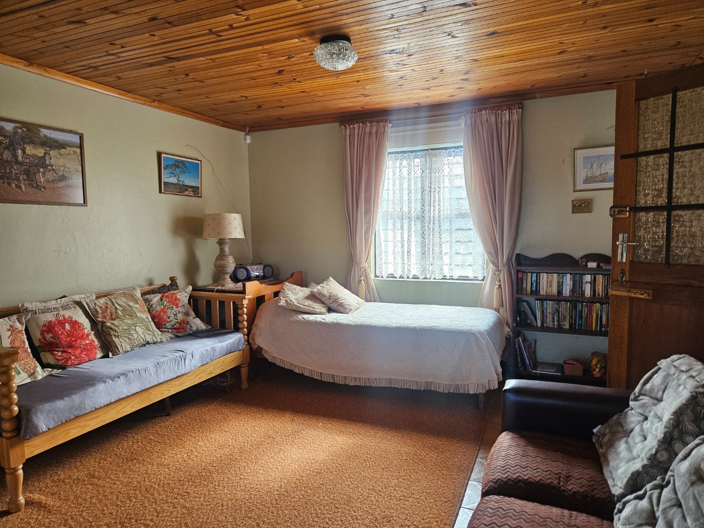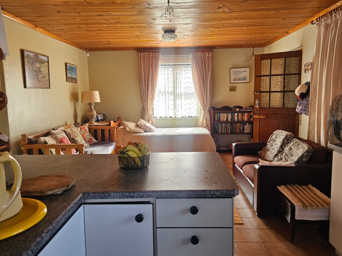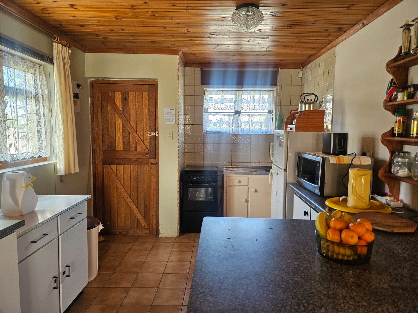 Featuring knotty pine ceilings, aluminium windows, and a braai room, the house includes two bedrooms, two bathrooms, open plan kitchen and living room. Add to this a study that can also be utilised as a third bedroom. The current layout maximises the available space, ensuring that a large family can be comfortably accommodated.