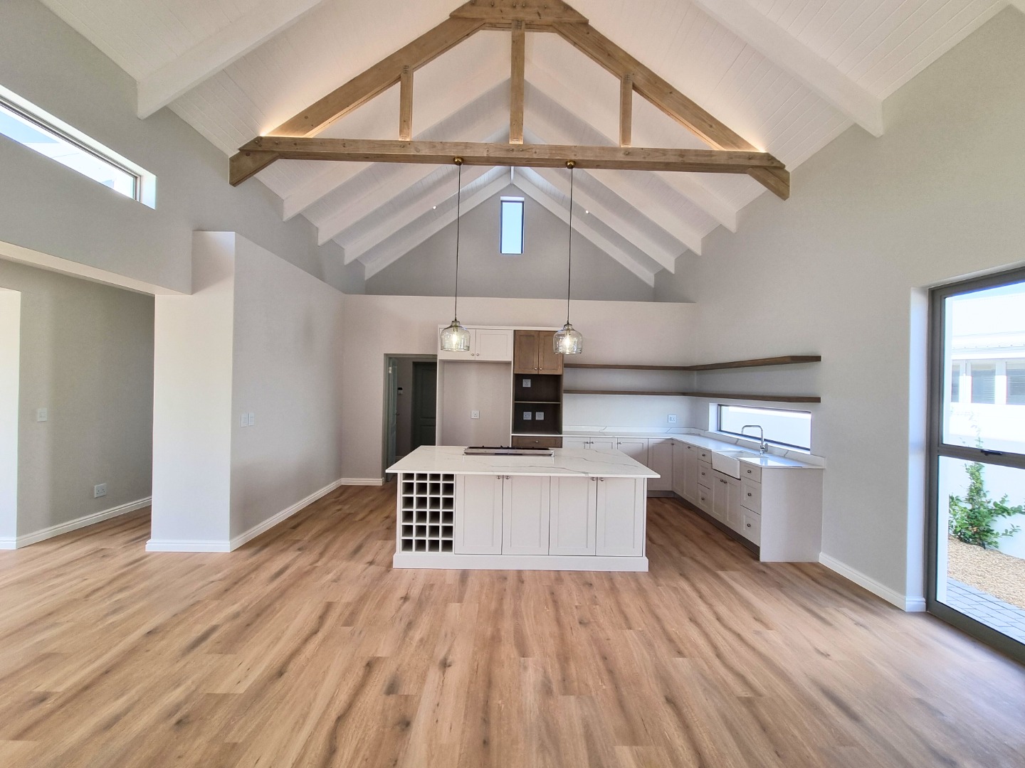 Enter through a welcoming hallway into an open-plan kitchen, dining, and lounge area flooded with natural light. The kitchen works hard with its central island, granite counters, quality appliances, and double-volume ceilings that create genuine space. A separate scullery with laundry facilities connects directly to the double garage, keeping the main areas clutter-free.