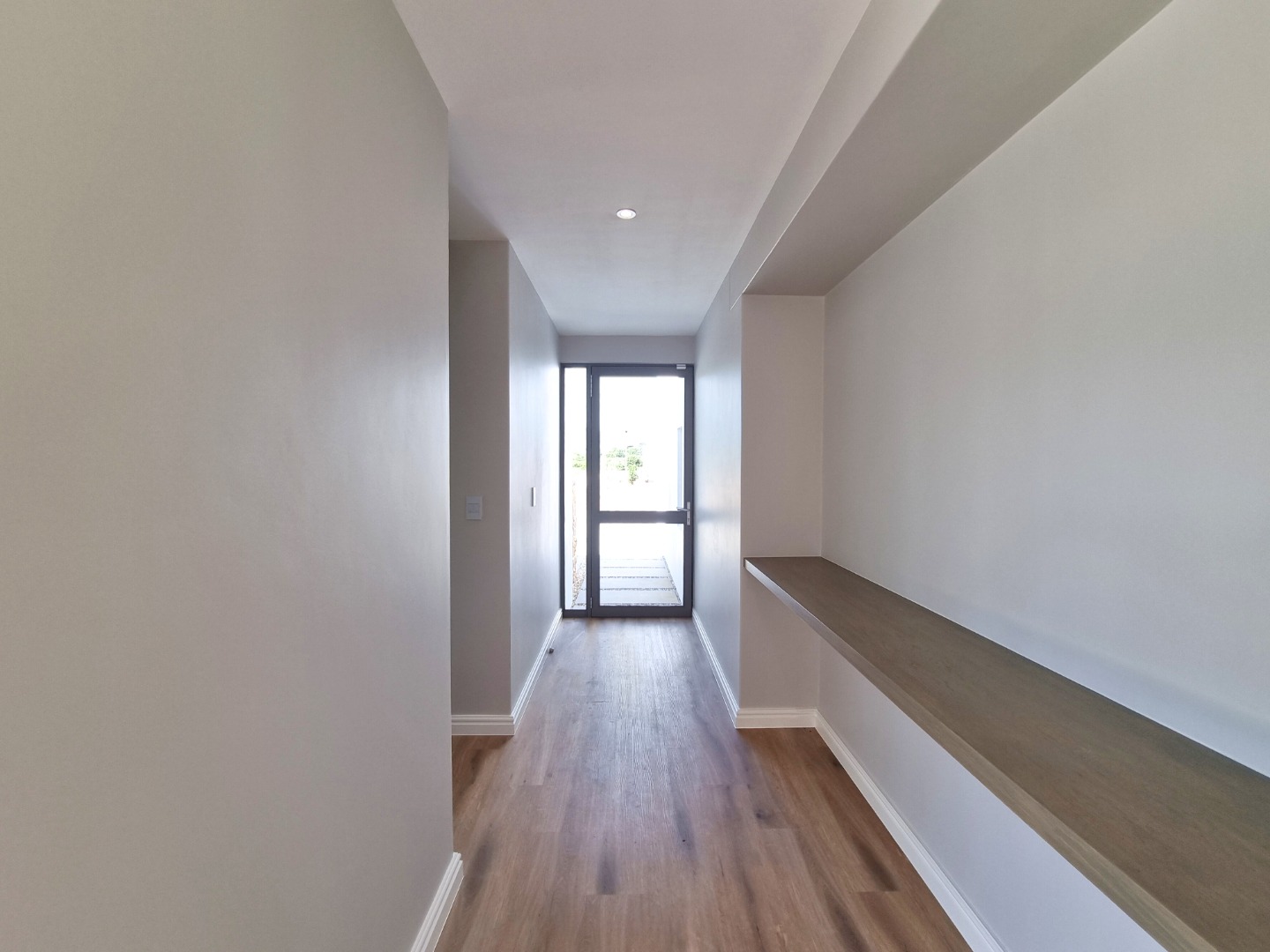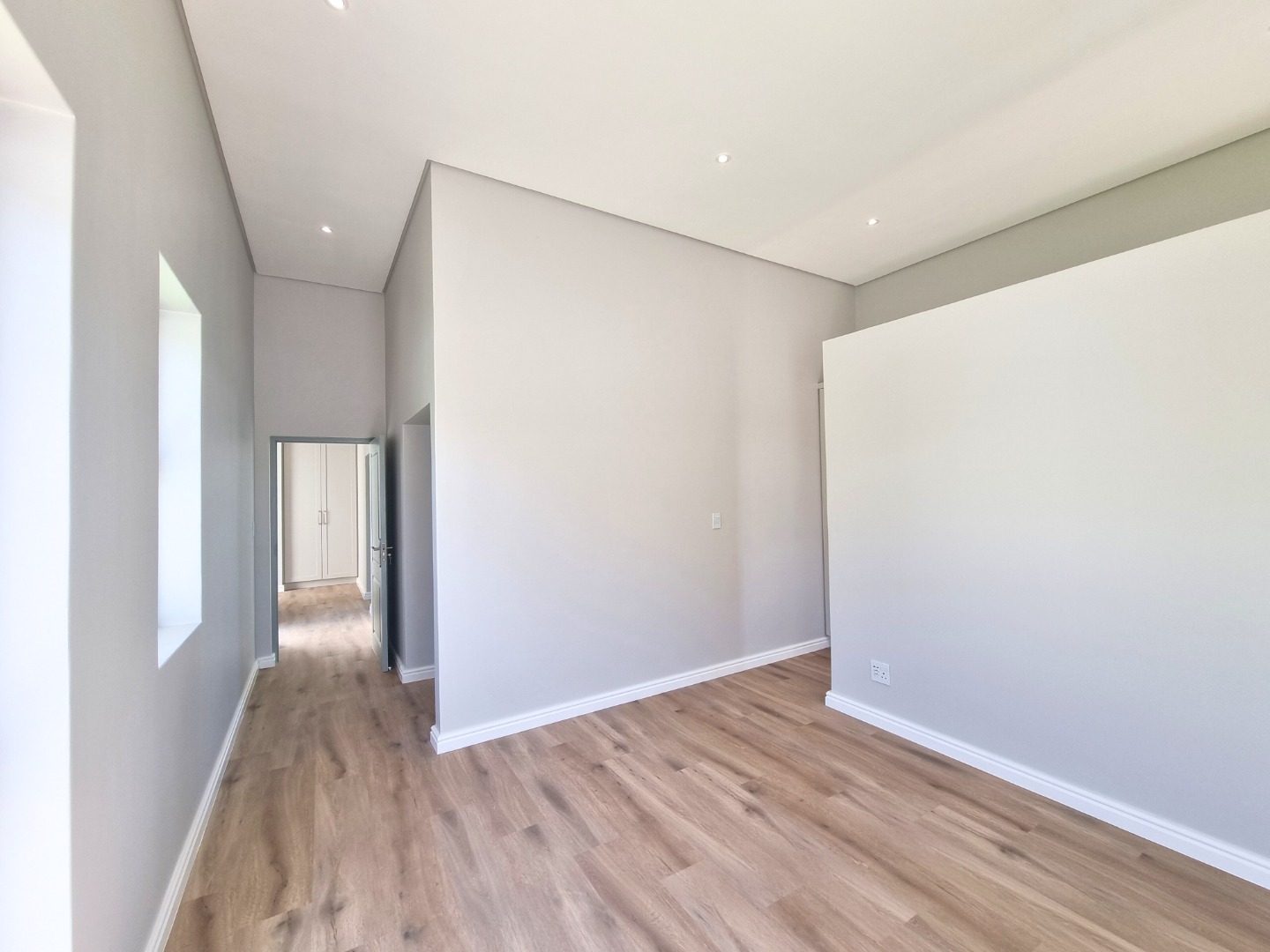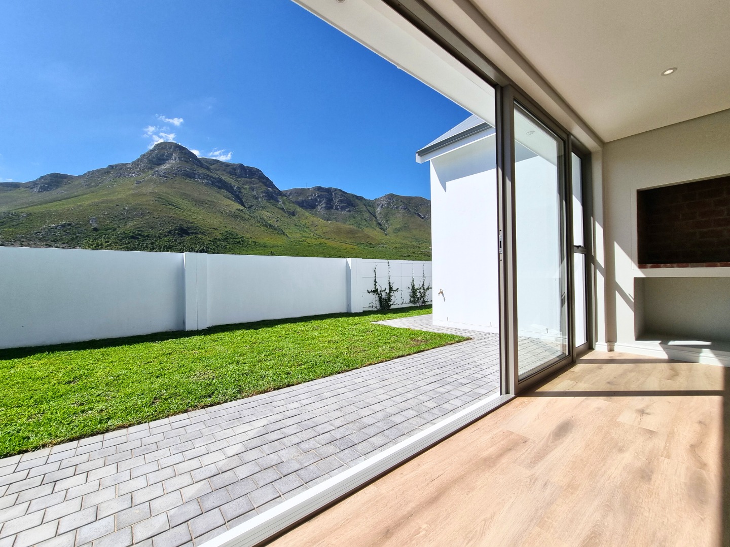 The dining area flows into a generous entertainment space with a built-in braai. Stacking doors open the room completely to your private garden and courtyard, framing those mountain views perfectly. This is where you'll spend your weekends.