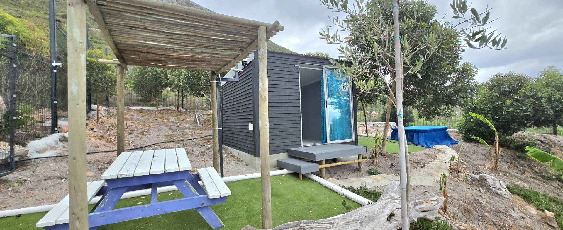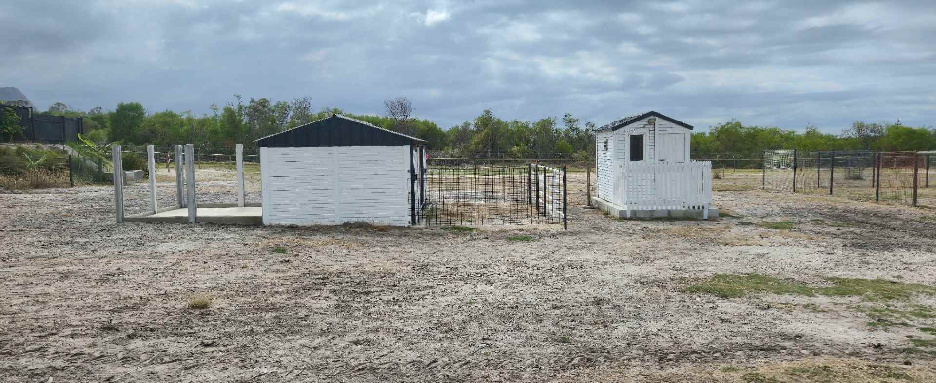 Infrastructure includes three equipment stores, feed storage, horse stalls, a caravan for farm manager accommodation, and an off-grid cabin with braai area, swimming pool, and bar. The cabin is secured with clear-view fencing, and seven surveillance cameras provide added peace of mind. The sale includes a tractor and farm equipment, allowing immediate use of the land.