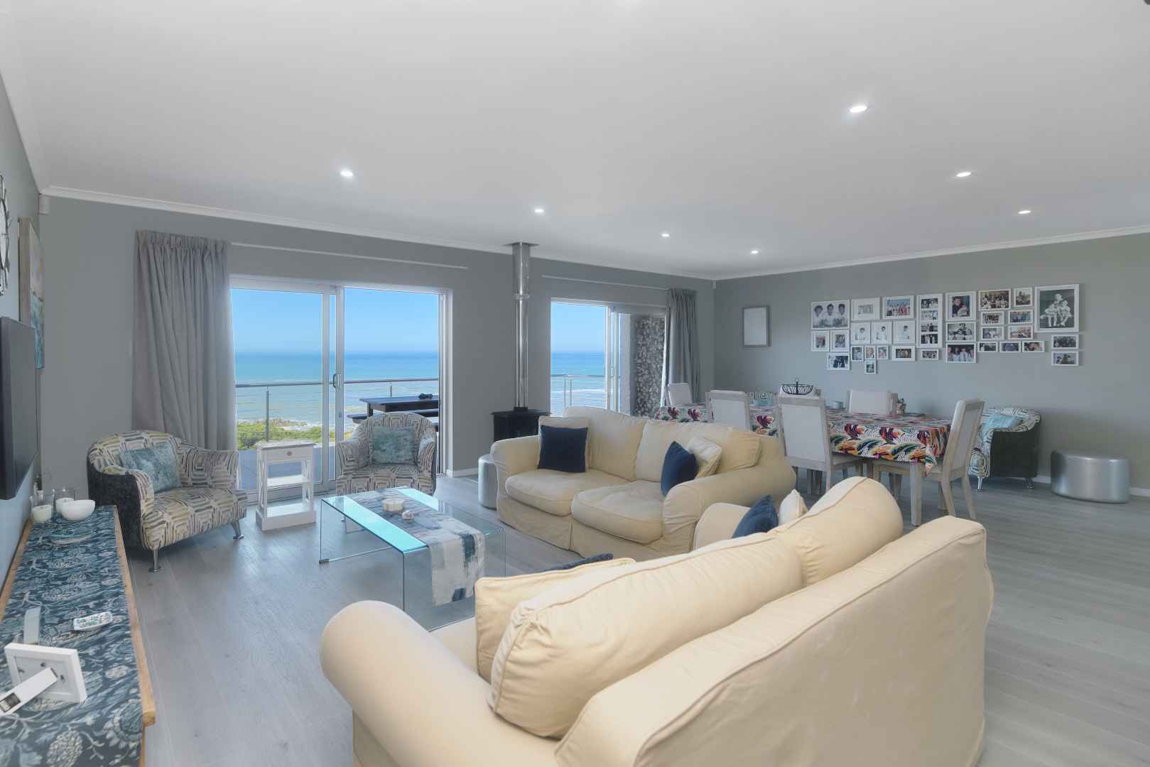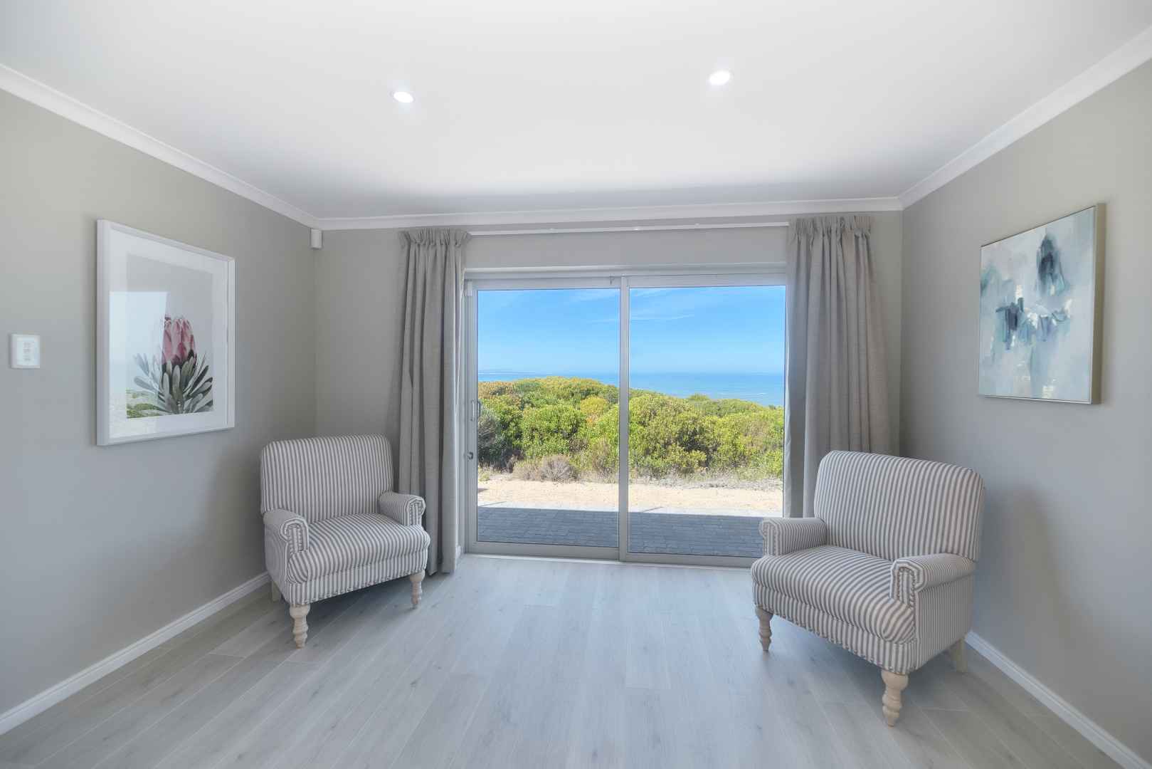 Perfectly positioned between the coastal villages of Kleinbaai and Franskraal, not only does this property boast panoramic views of the sea and surrounding landscape, it is energy efficient too, with an 8kw Inverter and 18 Solar Panels keeping you sustainable and off-grid. Freshly renovated, the first floor includes an open-plan living and entertaining space, with fire-place, which opens on to the balcony, along with a sleek and superbly appointed kitchen. Of the four spacious bedrooms on the first floor, two overlook the ocean and include private en-suite bathrooms - now picture yourself waking up to those views - that's luxury on a different level.
