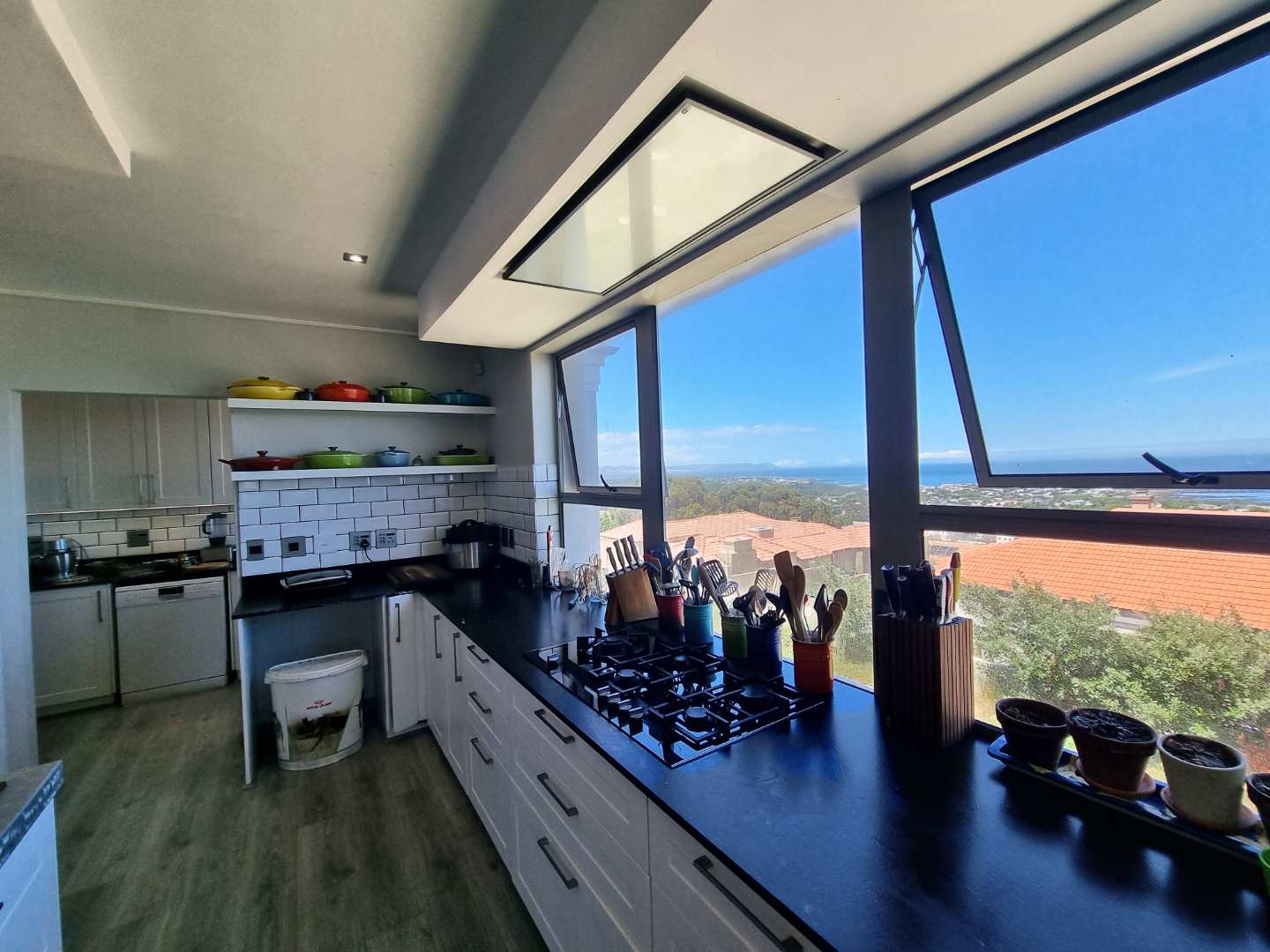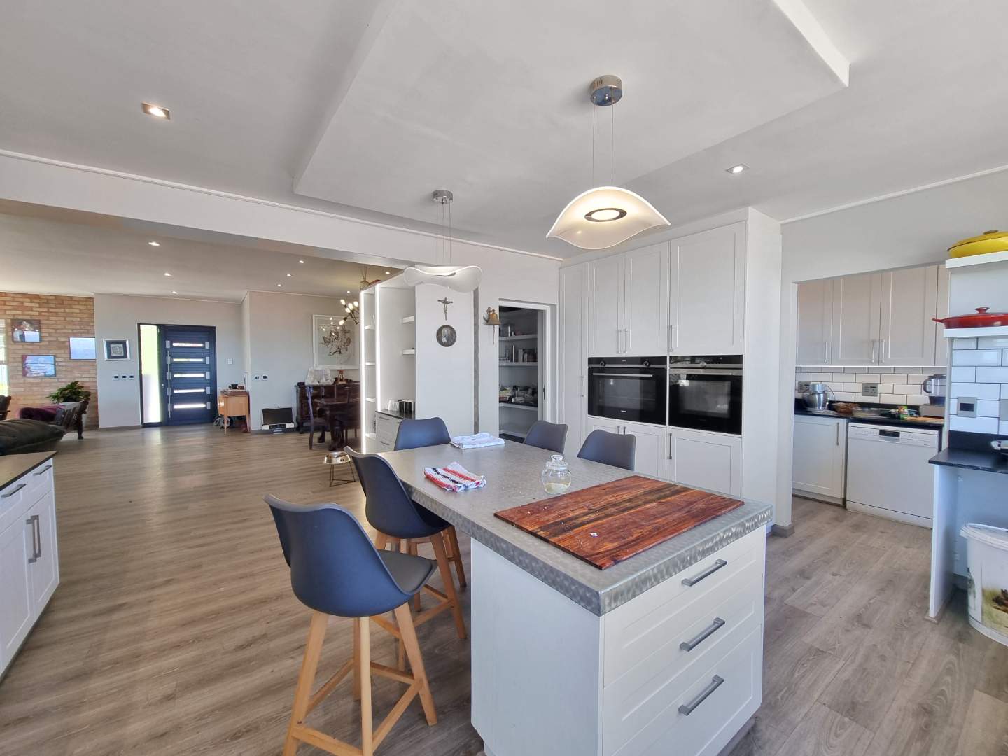 The heart of this magnificent home flows seamlessly through an open-plan design that epitomizes effortless entertaining. A chef's dream kitchen, outfitted with premium integrated appliances, a generous scullery, and separate pantry, opens gracefully into the dining area and inviting TV lounge, warmed by a striking wood-burning fireplace. Step onto the expansive entertainers' patio, where a sleek stainless steel fire and gas braai combination beckons you to savor long evenings overlooking the Onrus River and the endless ocean beyond-a setting where memories are made and moments are treasured.