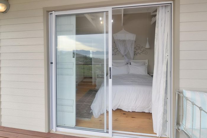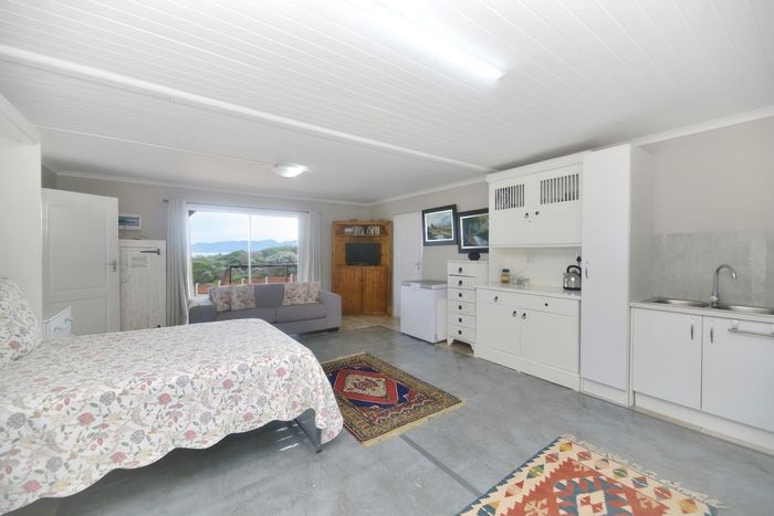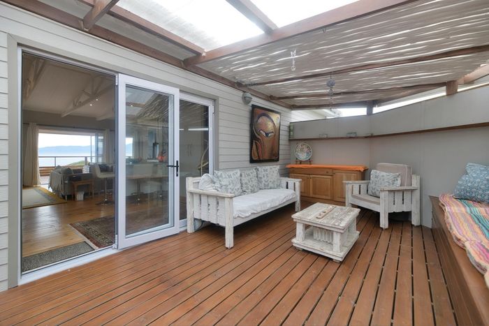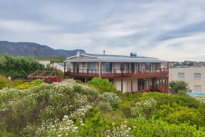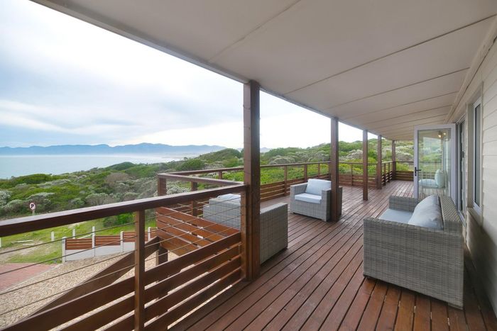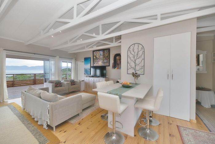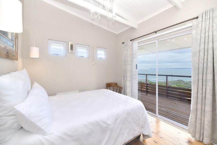 Live sustainably by Walker Bay Reserve with whale-watching, fynbos and Die Plaat beach views; expansive sea-view deck, studio flatlet, modern kitchen and vegetable garden—three beds, four baths.