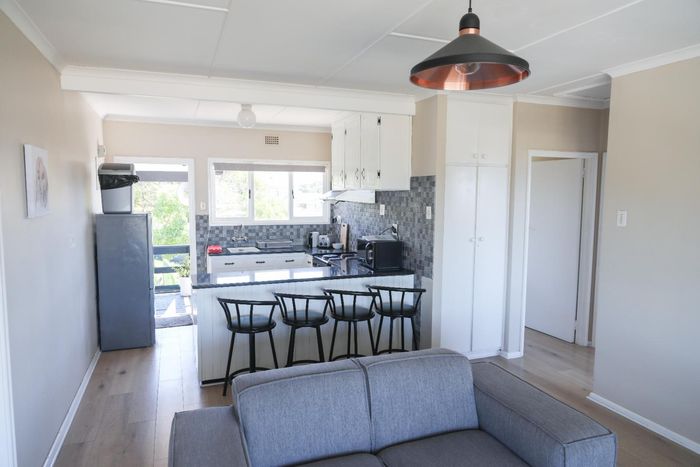 Relax in coastal Sandbaai, Hermanus with easy lock-up-and-go living — furnished apartment featuring a spacious wooden deck with sea views, two bedrooms, one bathroom, and parking.