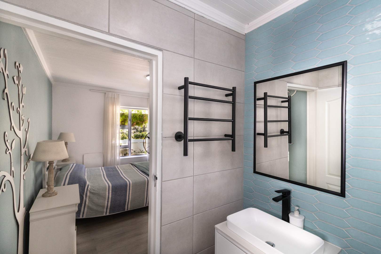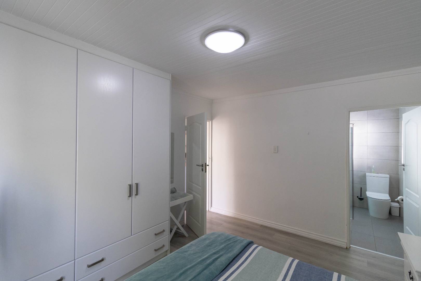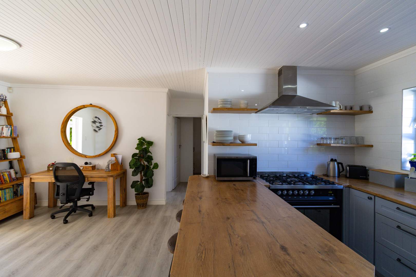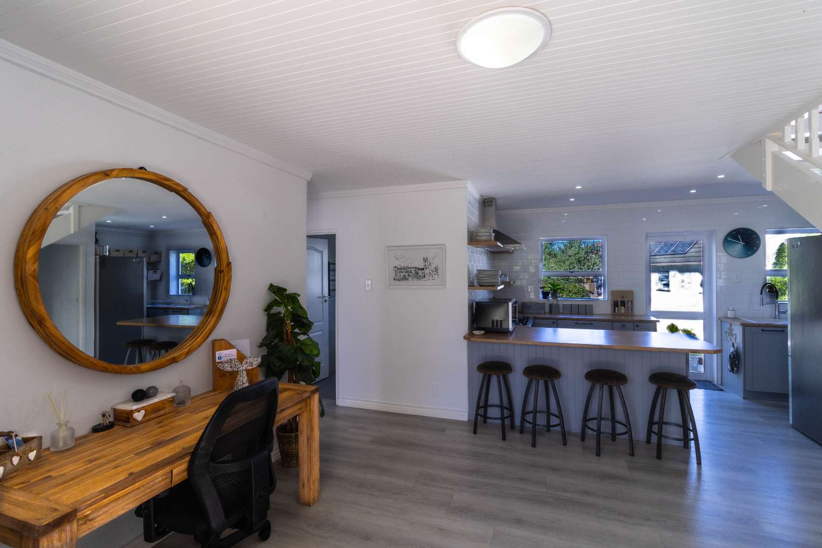 The ground floor welcomes you with a cozy open-plan kitchen and scullery, setting the tone for relaxed, functional living. Three of the four beautifully appointed bedrooms are found on this level, each filled with an abundance of natural light and finished with quality vinyl flooring and elegant cabinetry. Two bedrooms share a stunning modern bathroom, while a dedicated guest suite offers complete privacy with its own en-suite, a thoughtful touch that makes hosting family and friends an absolute pleasure.