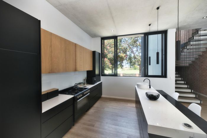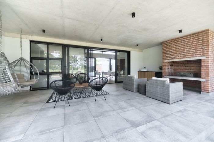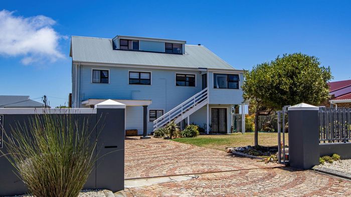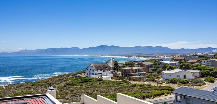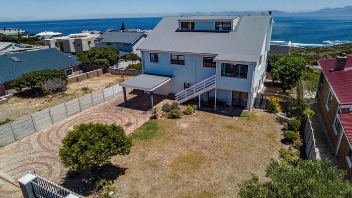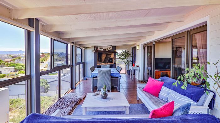 Coastal entertaining and dual-family living in Franskraal, Gansbaai — expansive balconies with distant sea views, built-in braai, private garden; five bedrooms, three bathrooms and two garages.