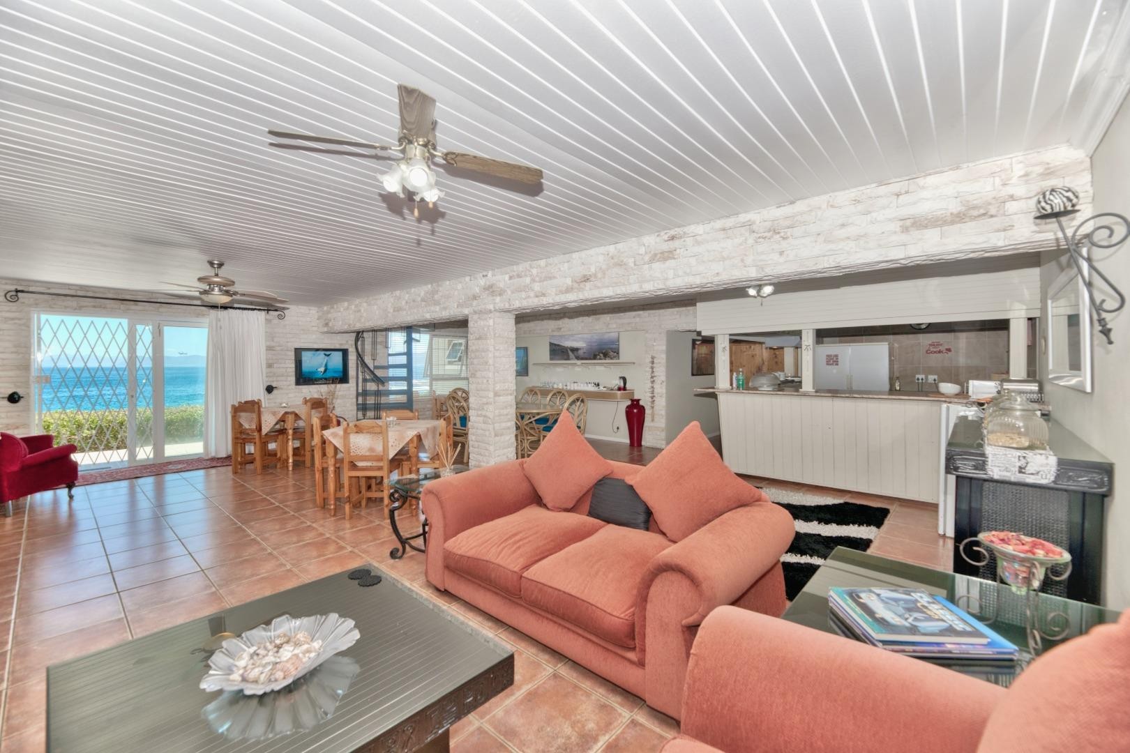 The home features five income-producing guest suites (four with sea-view balconies), as well as an additional suite with a private lounge and utility room. First-floor highlights include a gourmet kitchen, formal lounge, and office area, while the ground floor offers a large dining room, a second kitchen, and two guest suites opening onto private balconies. Outdoors, guests can enjoy a sparkling swimming pool, two double shaded carports, a garage, and fully walled grounds with remote-controlled access.