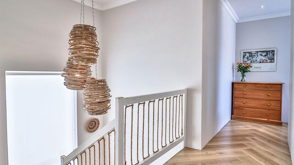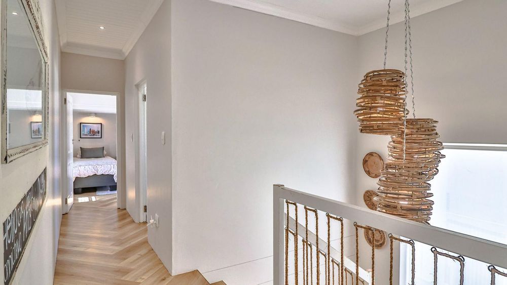 Upstairs, the first-floor highlight is the uninterrupted 180-degree ocean view from the entertaining area (with built-in braai), kitchen, and open-plan living room. The kitchen, centred around an island, features a gorgeous pantry, adjoining scullery, and includes a fireplace with a Dover stove, ensuring toasty winter nights. Two bedrooms share the first floor, of which the master suite is extra special, boasting a sea view, balcony, walk-in closet, and en-suite bathroom.