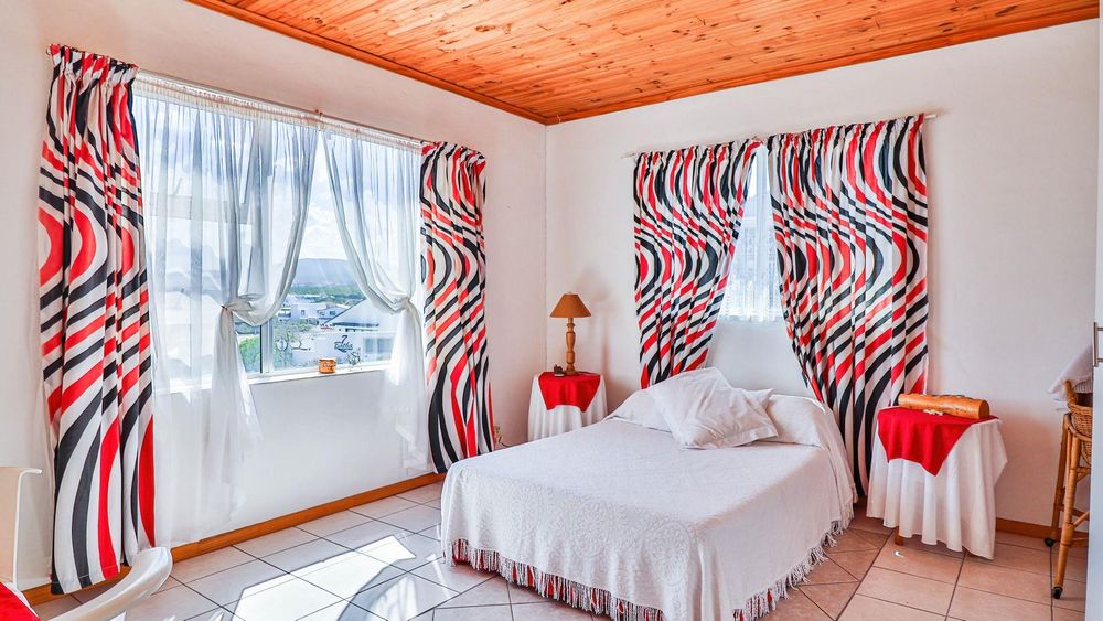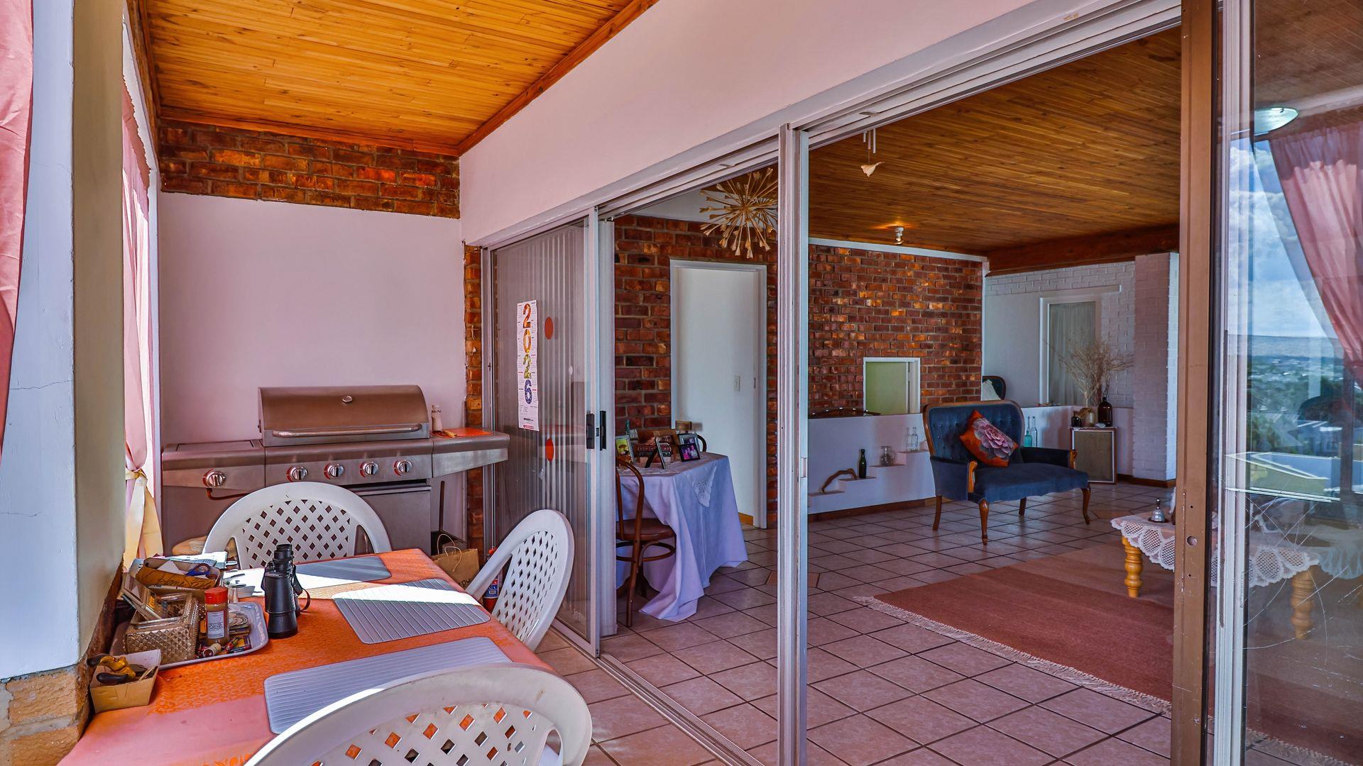 The low-maintenance, paved and landscaped front yard leads to the ground floor, which includes a double garage, a 24m2 accessible storage space, and a prettily styled reception area with stairs leading up into the main part of the home. Fully tiled and featuring knotty pine ceilings, brick accents, and a built-in braai, the interior is zoned into four inter-linked sections: an enclosed balcony with sea views, a living area, a TV lounge / dining space, and an open-plan modern kitchen with a breakfast counter. Leading off from the living area are four comfortable bedrooms, one of which is en-suite, as well as two additional bathrooms, one of which includes a washing machine connection.