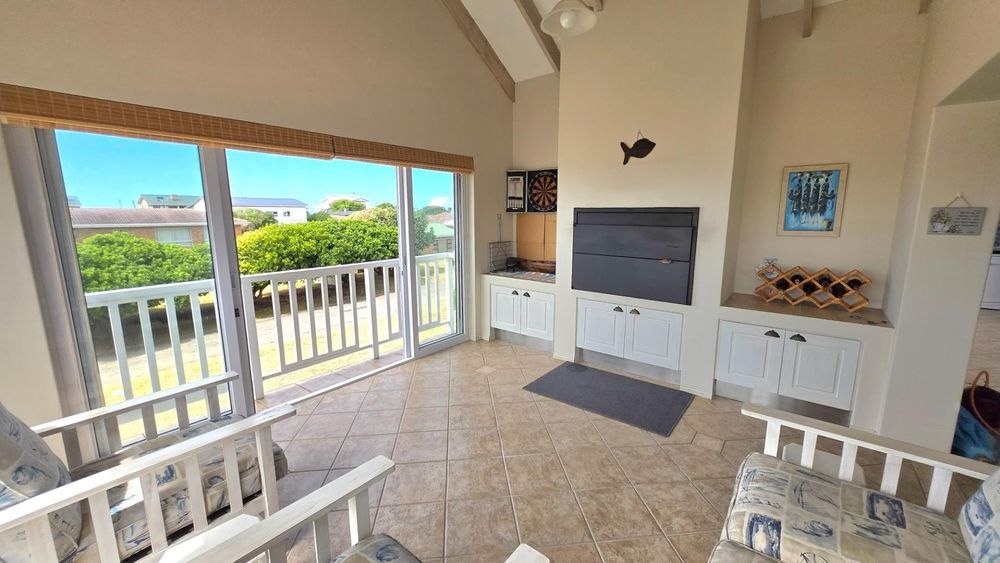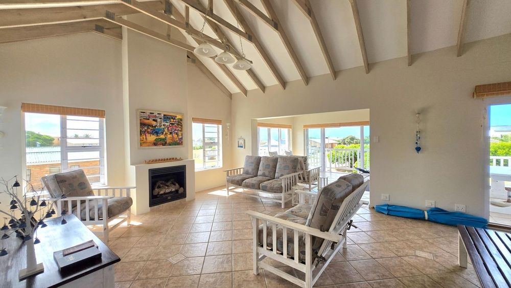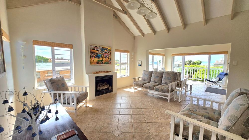 The kitchen offers an open-plan style with a pantry, making meal preparation a delight. The living area features a cozy gas fireplace and a built-in braai area with distant sea views, adding to the charm of this home. Enjoy the outdoors with a spacious balcony just off the kitchen, perfect for morning coffee or evening relaxation. A secondary balcony overlooks the courtyard at the back, complete with an outside shower for those sandy beach days.