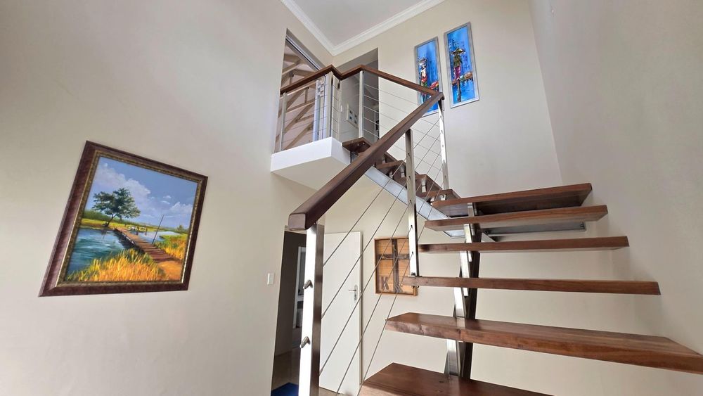 The spacious main bedroom features an en-suite bathroom, while the two guest bedrooms are served by a second bathroom, ensuring privacy and convenience for all. As you enter the house, you're greeted by an amazing staircase that leads to the upper level, where the kitchen, braai room, living, and dining areas are located. This design creates a seamless flow and makes it perfect for entertaining, with all bedrooms conveniently situated downstairs.