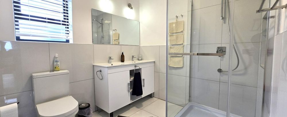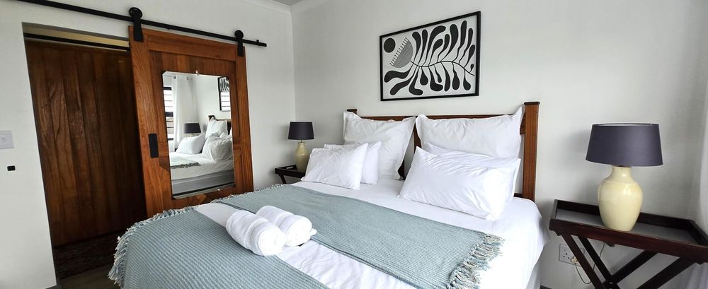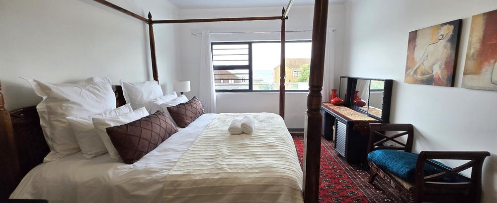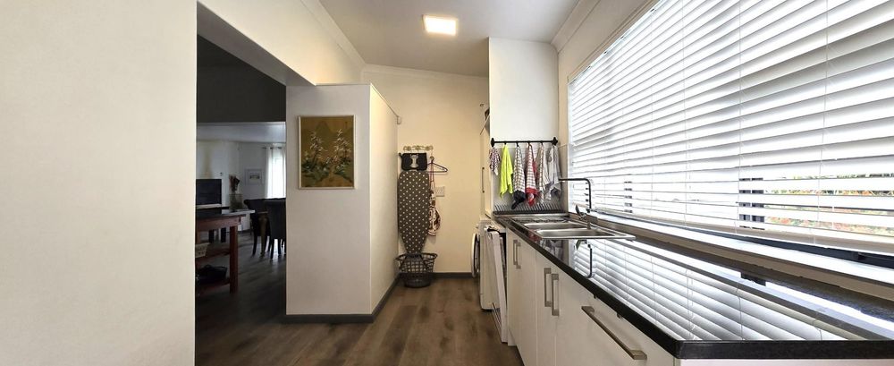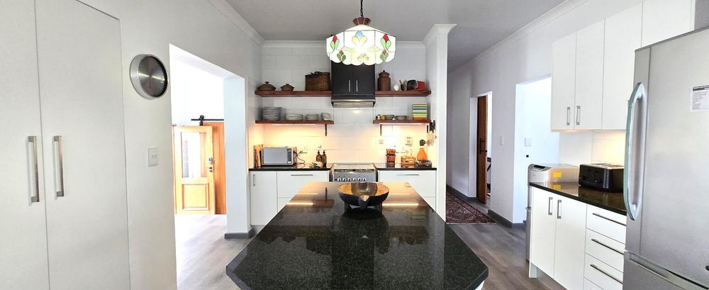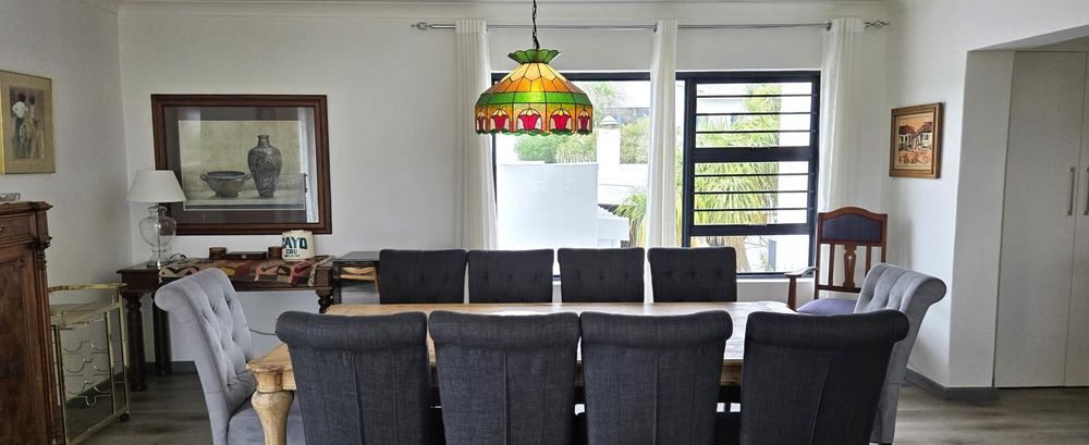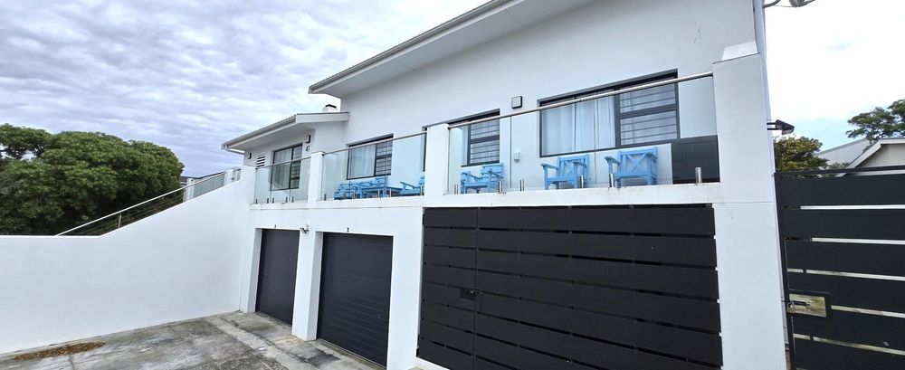 The property features five bedrooms, three of which are luxurious en-suites boasting sweeping sea views. A separate two-bedroom wing provides added privacy and flexibility, making it perfect for guests or dual living arrangements. The open-plan interior is designed for both relaxation and entertainment, flowing seamlessly from the lounge with built-in braai to a sophisticated dining area and a gourmet kitchen fitted with a gas hob, electric oven, wine cooler, and separate scullery. Every detail reflects quality, from the bespoke wardrobes to the premium Van Acht sliding doors, while the magnificent master suite offers uninterrupted ocean views and a spa-like bathroom.