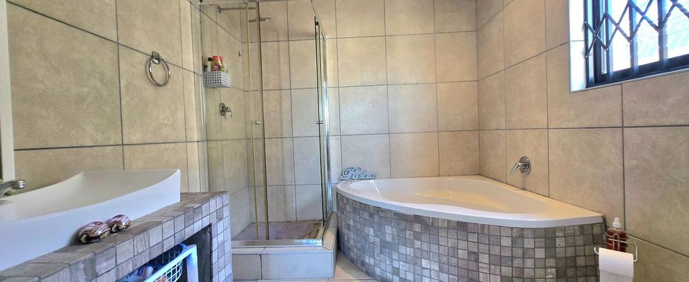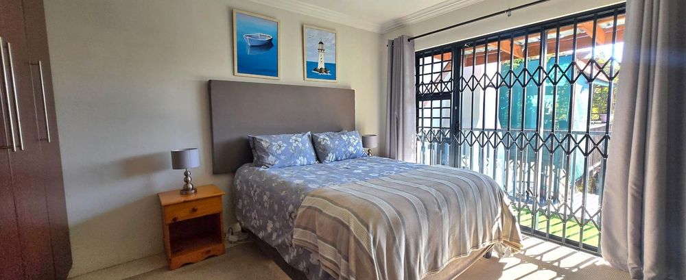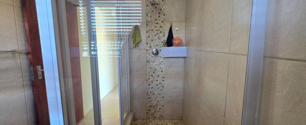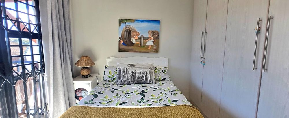 The heart of the home is a beautifully finished kitchen, with smooth granite countertops and a separate walk-in pantry. It connects effortlessly to a dining area that opens out to a covered patio—perfect for weekend braais or evening meals with friends. Upstairs, a formal lounge with a built-in fireplace and private balcony provides a peaceful retreat with distant views of the sea.