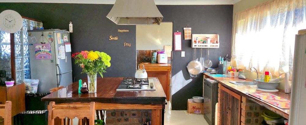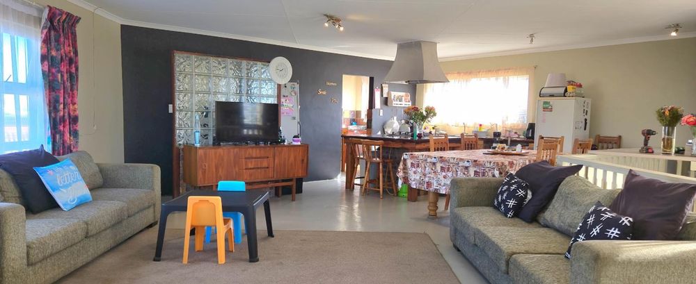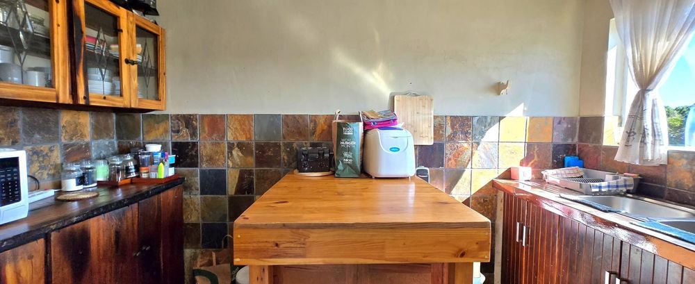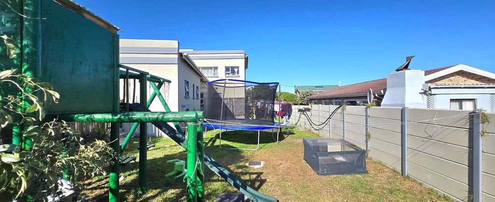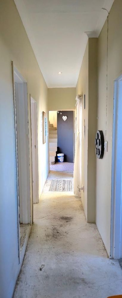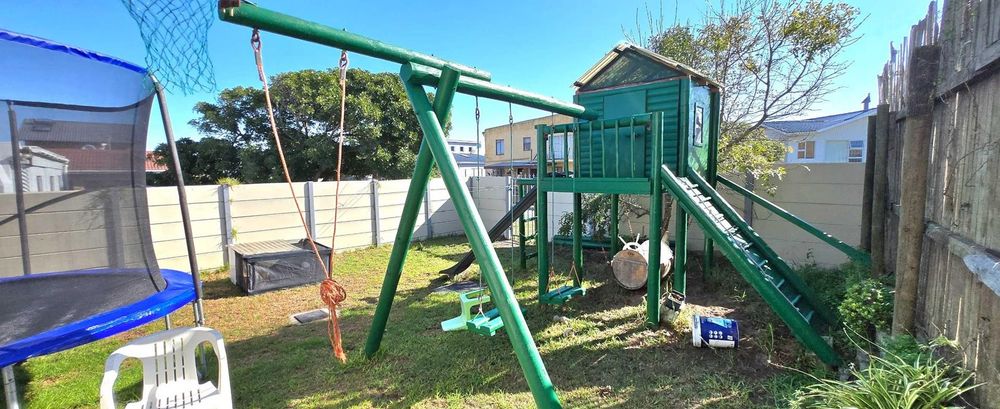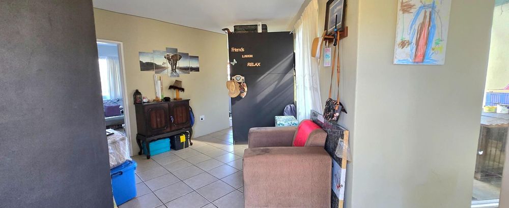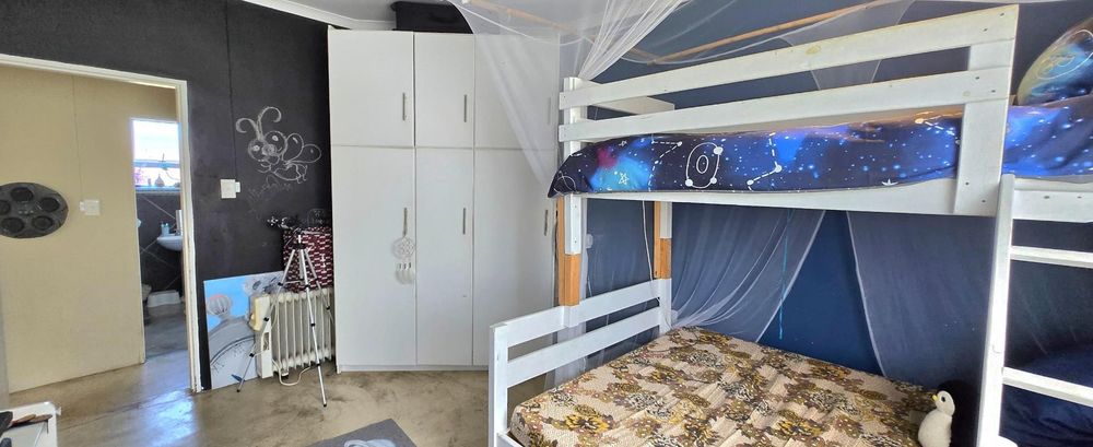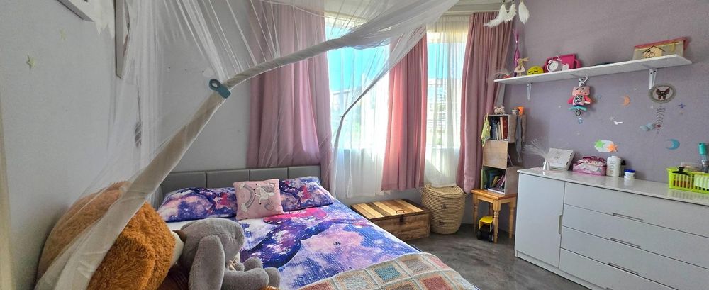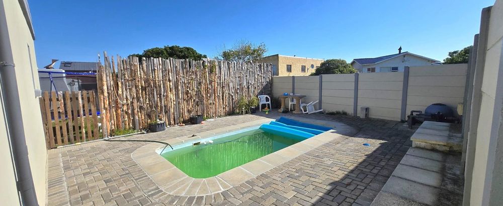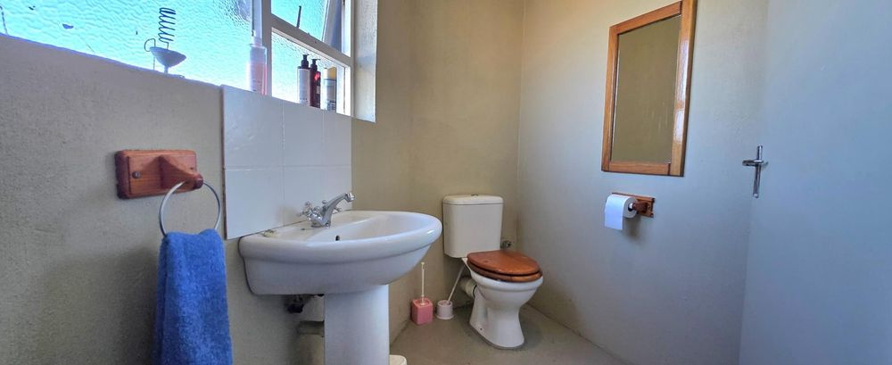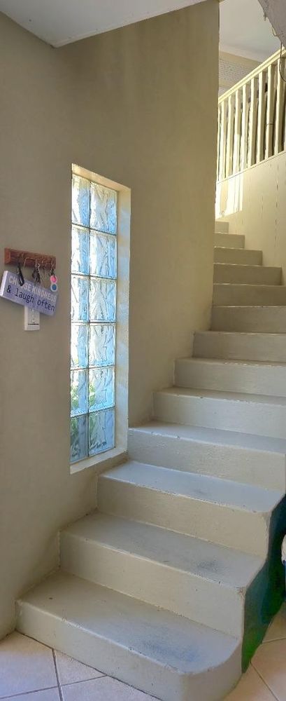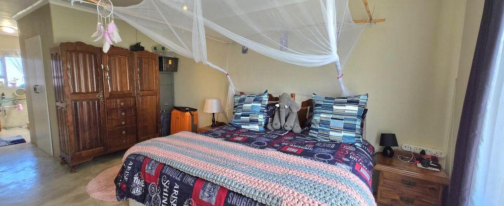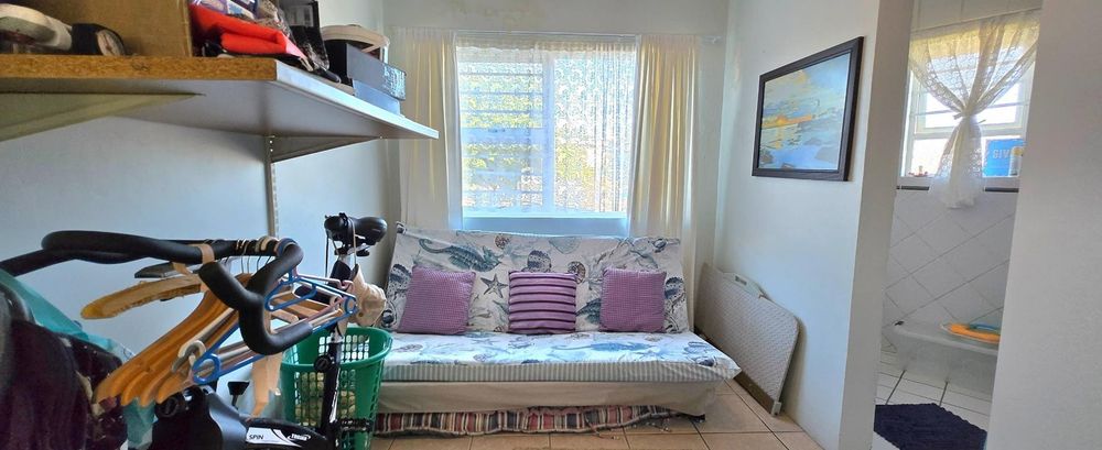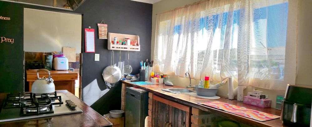 The open-plan kitchen is ideal for modern living, featuring an adjacent scullery for added convenience. The upstairs living and braai room offer distant sea views, perfect for entertaining all year round thanks to the built-in indoor braai. The home also features low-maintenance cement screed flooring throughout.
