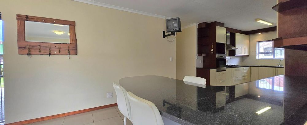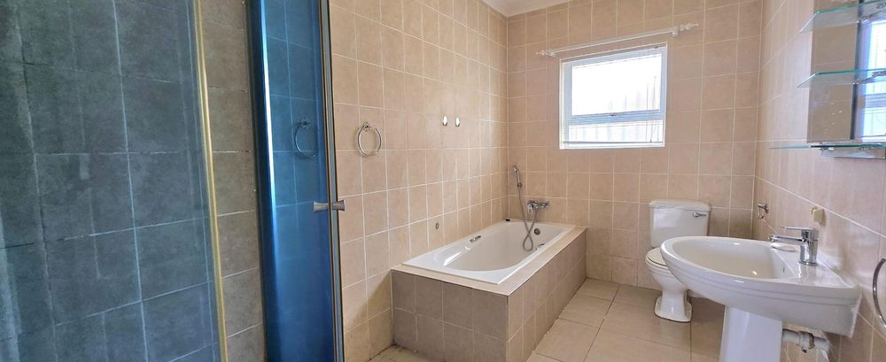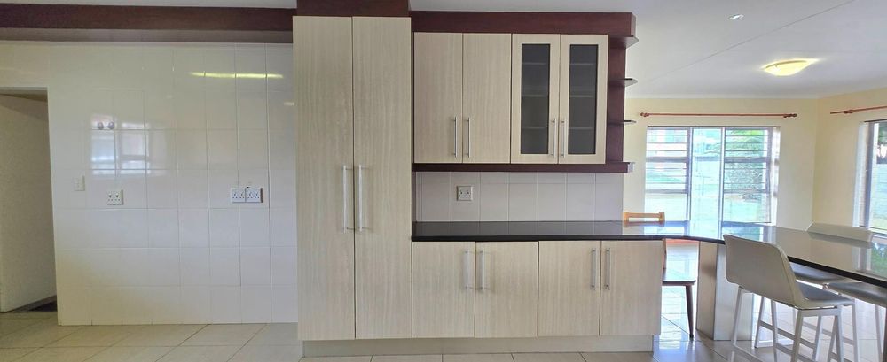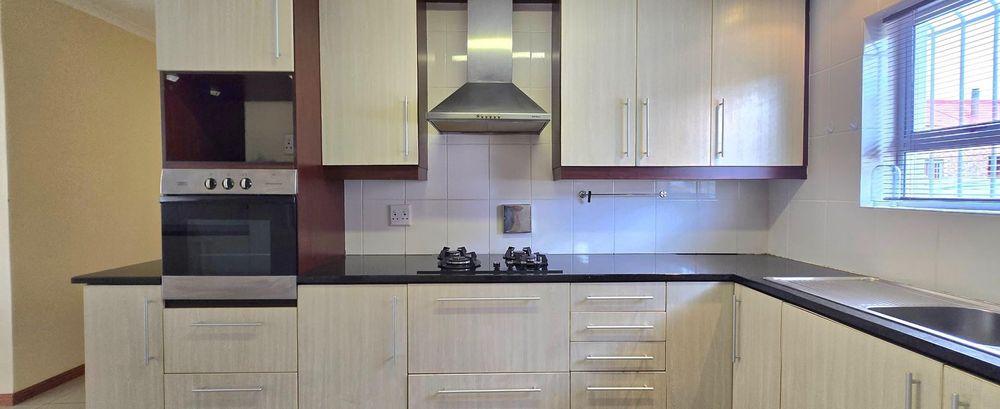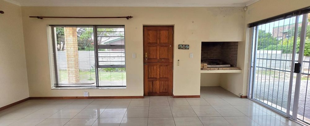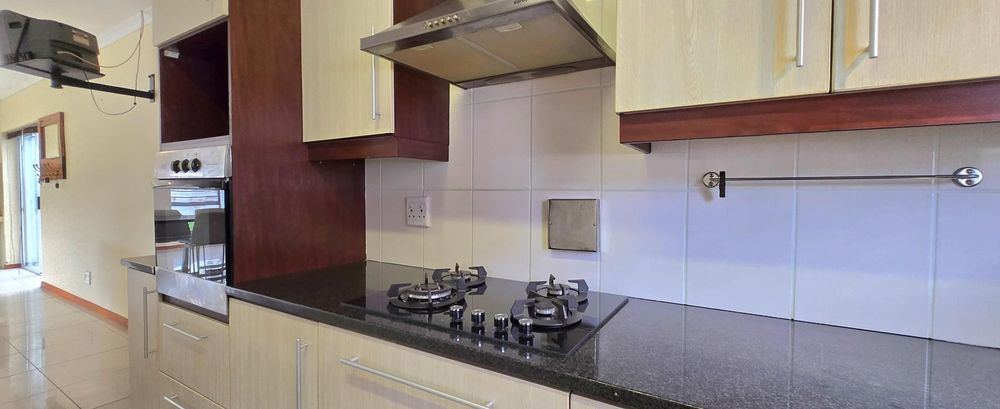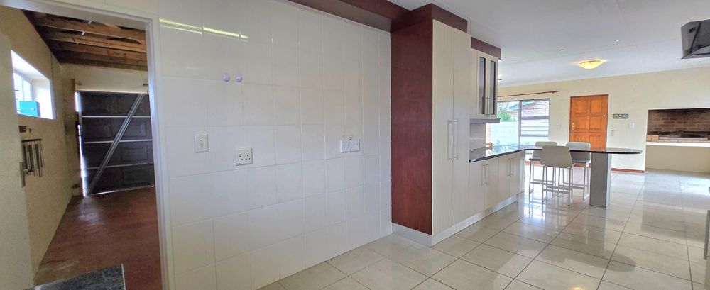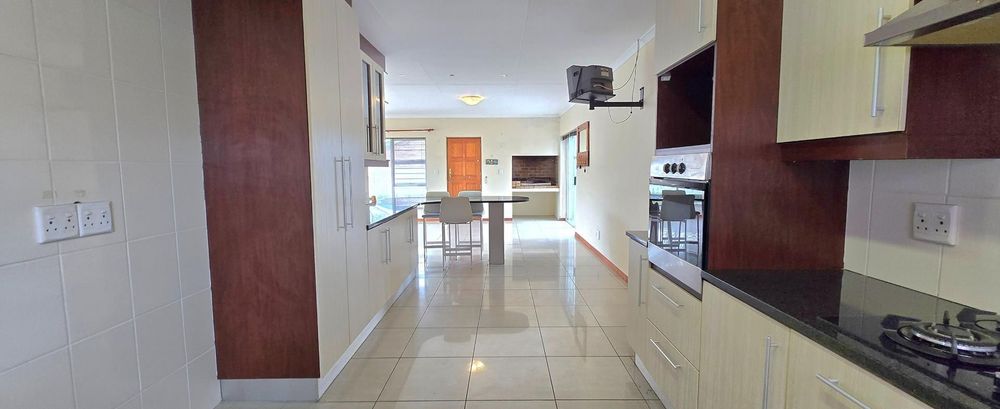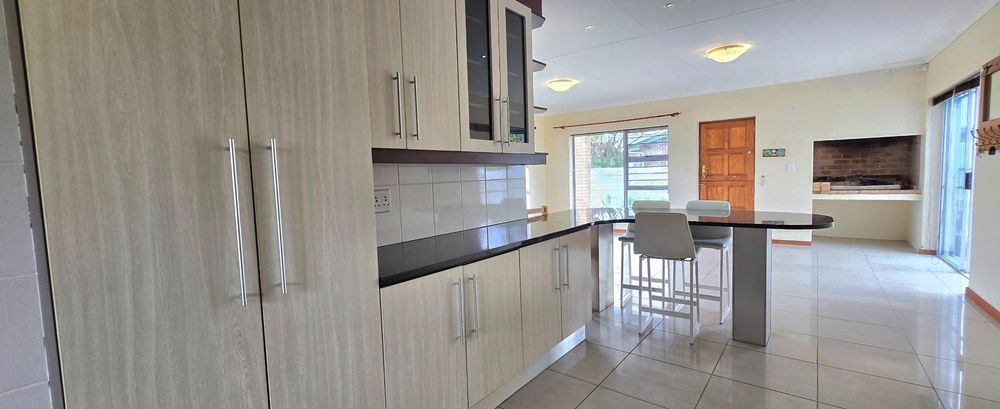 The home offers a spacious, modern kitchen with a gas hob, ample cupboards, and direct access to both the garage and backyard. An open-plan living, dining, and indoor braai area flows seamlessly to the patio and low-maintenance garden, creating a perfect space for entertaining or relaxing with family.
