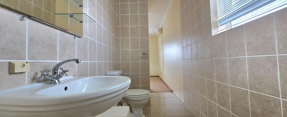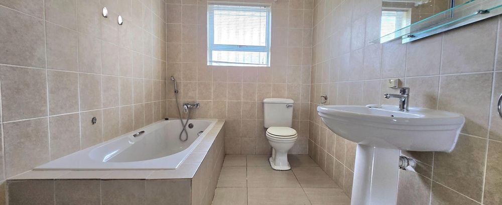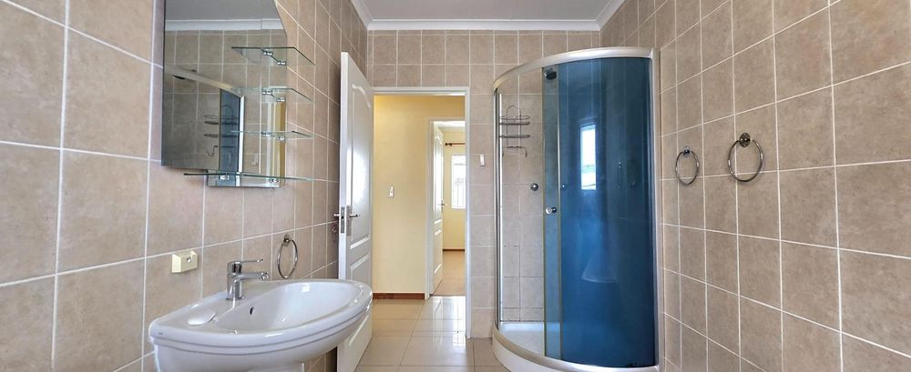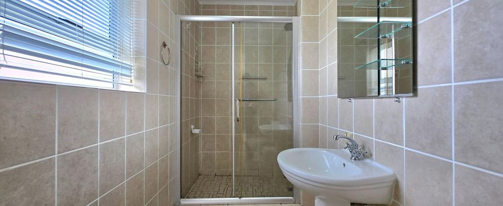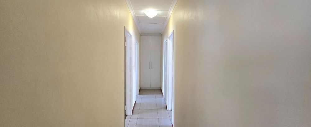 The main bedroom features an en-suite bathroom and air conditioning, while the two additional bedrooms share a full bathroom. Throughout the home you'll find built-in cupboards, blinds, burglar bars, and thoughtful touches like a linen cupboard in the hallway. The double garage includes one automated and one manual door, with plenty of extra storage space.