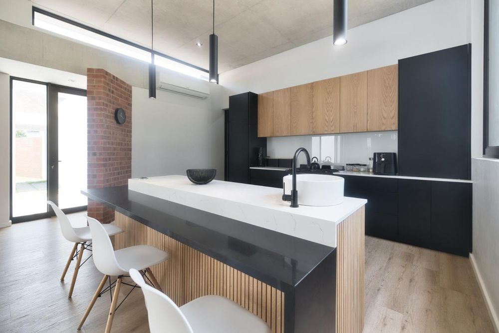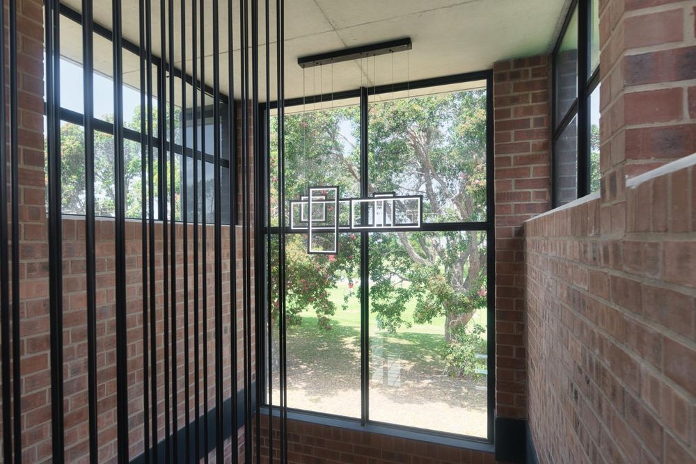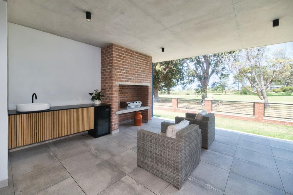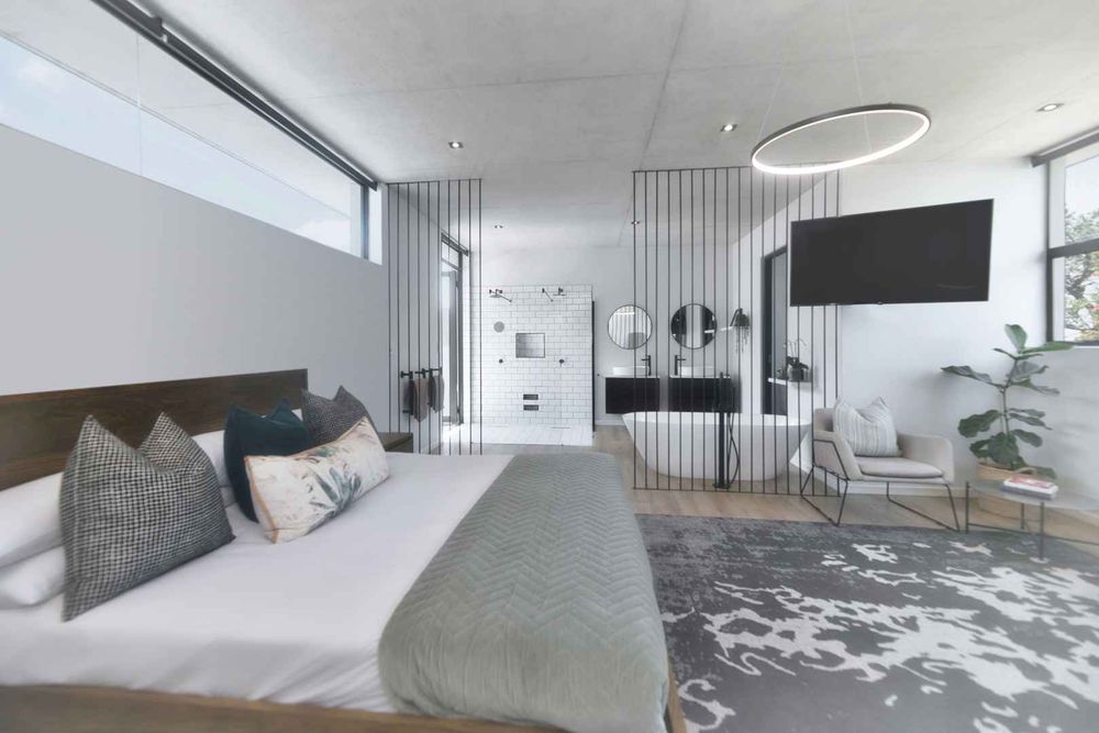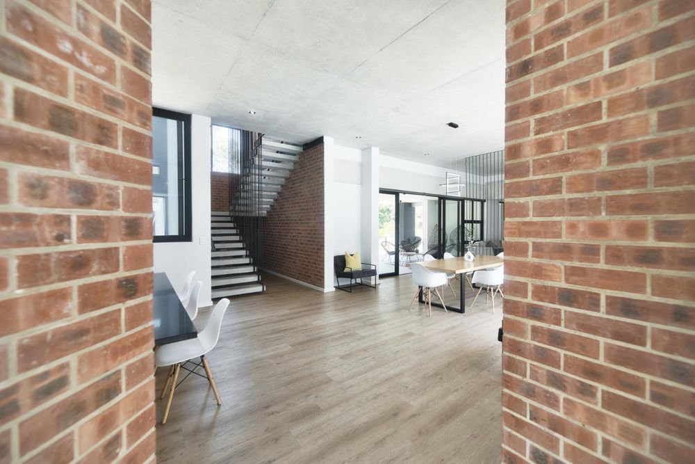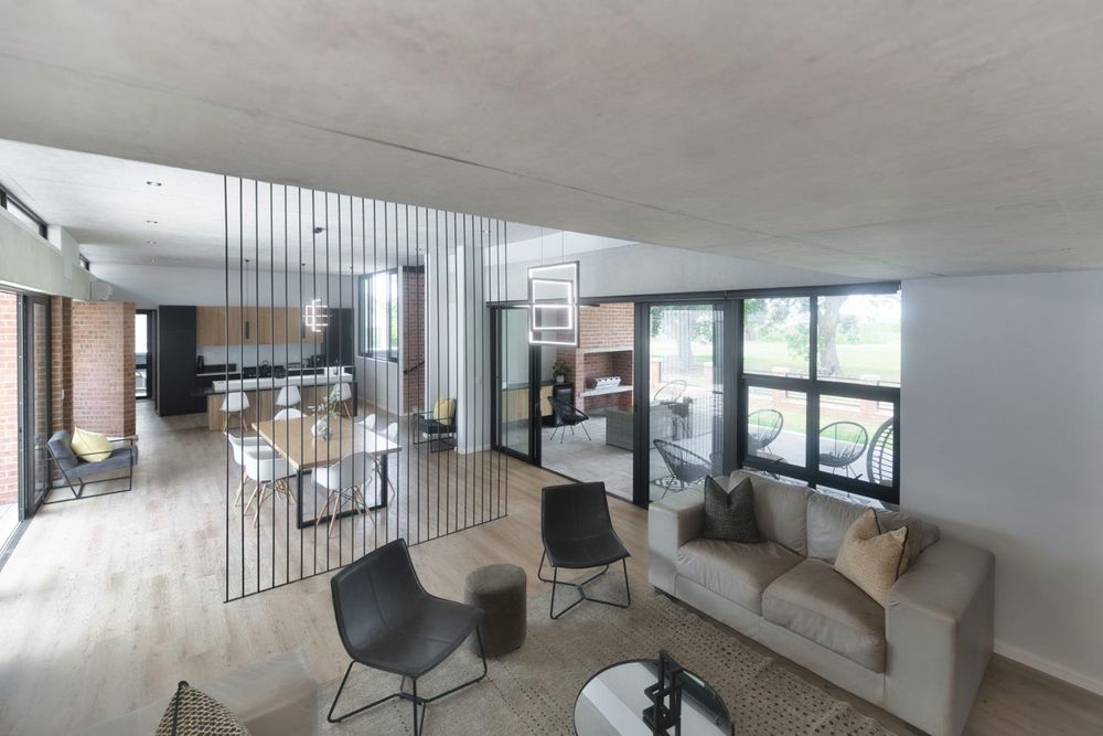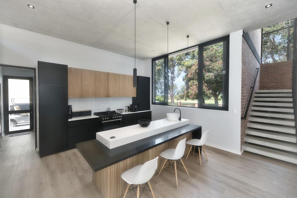 Walking in it feels like an open-plan sanctuary where exposed concrete ceilings and artfully placed brick accent walls create a distinctive aesthetic. The seamless flow between the lounge, dining area, and a contemporary kitchen, complete with a pantry and a stylish island, is enhanced by expansive sliding glass doors and windows. These special doors invite abundant natural light and effortlessly merge indoor luxury with the serene outdoor environment, perfect for entertaining or quiet contemplation.