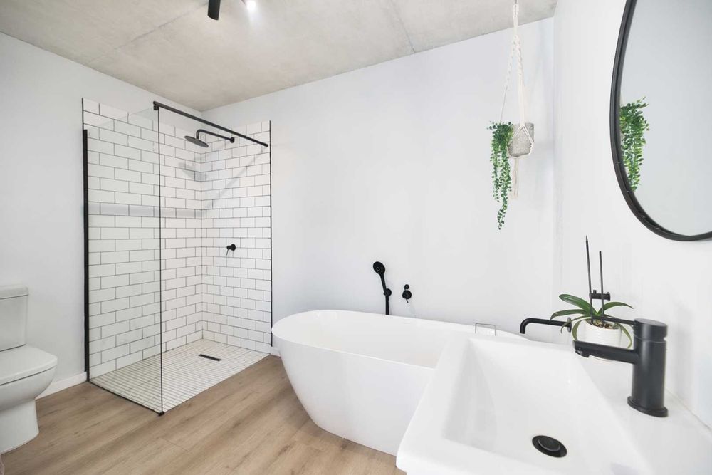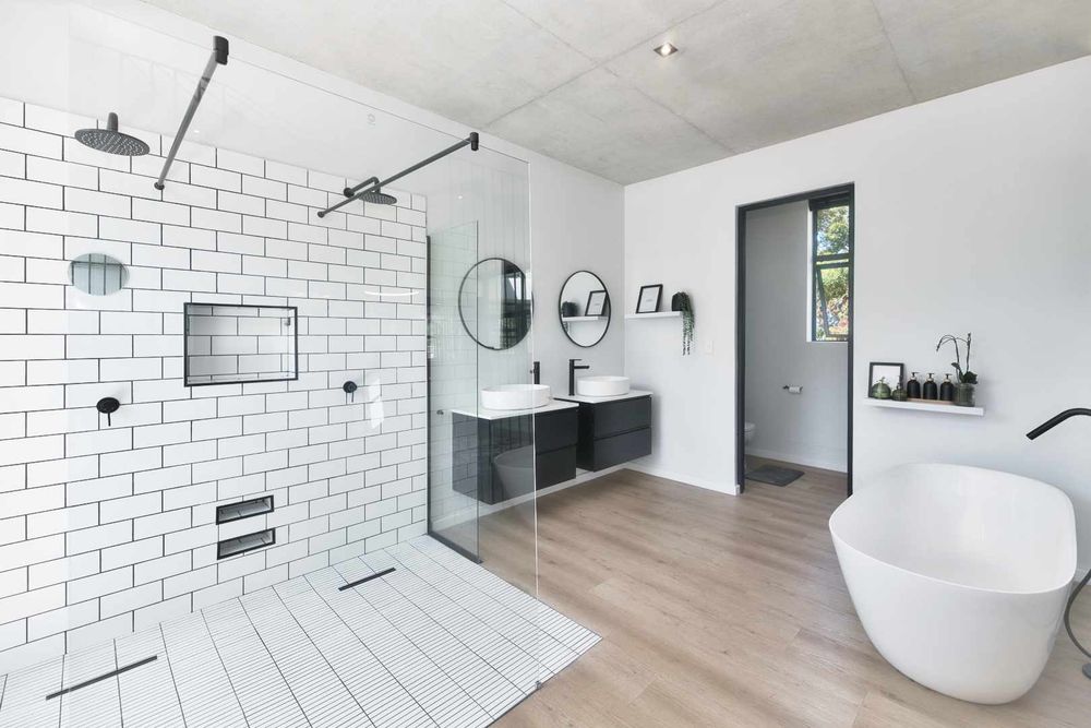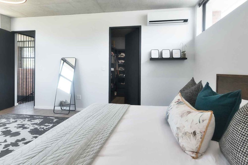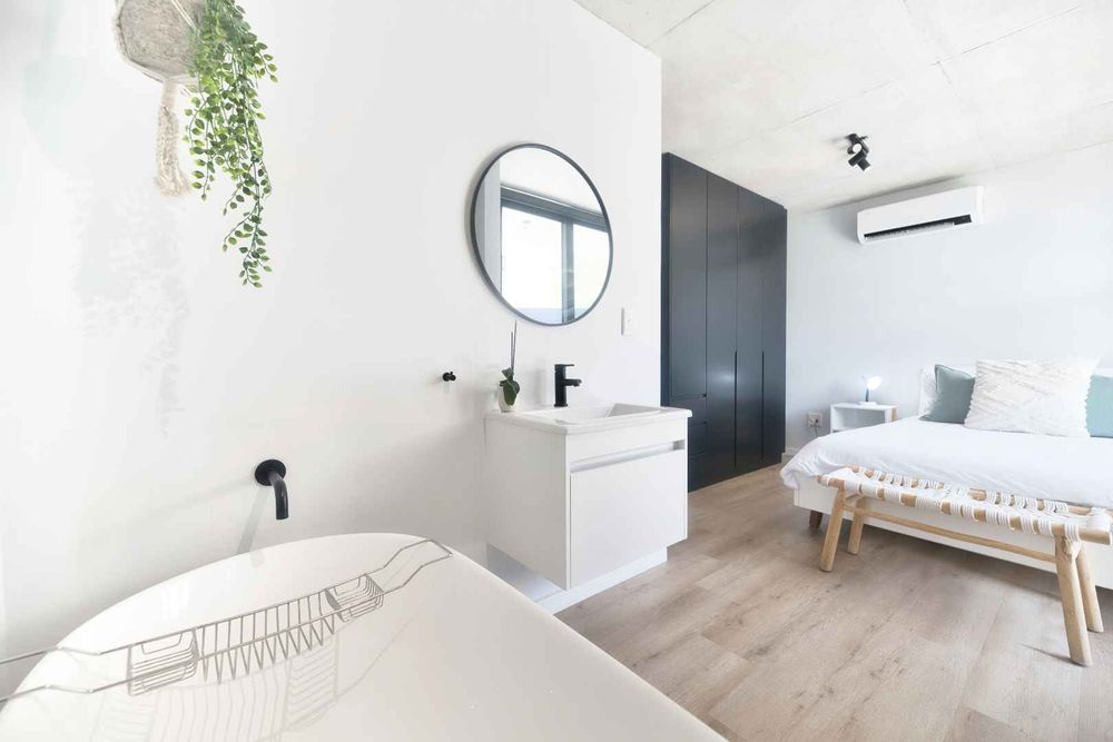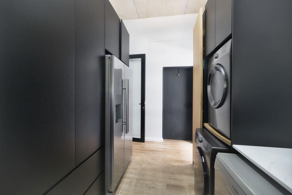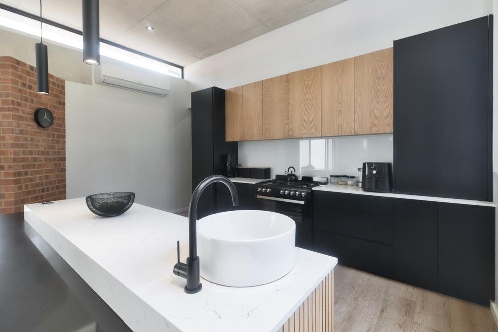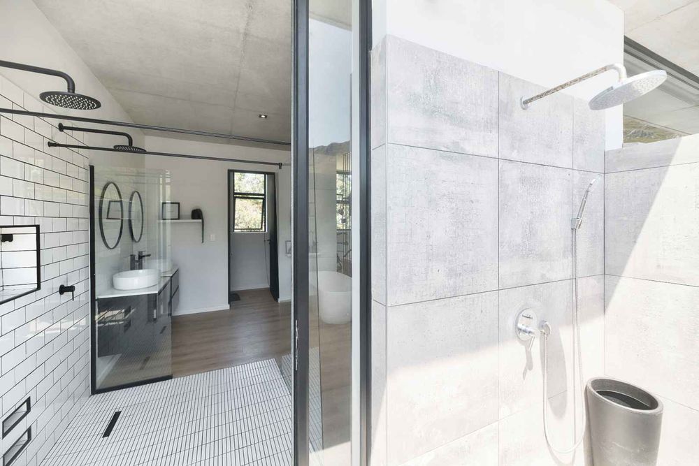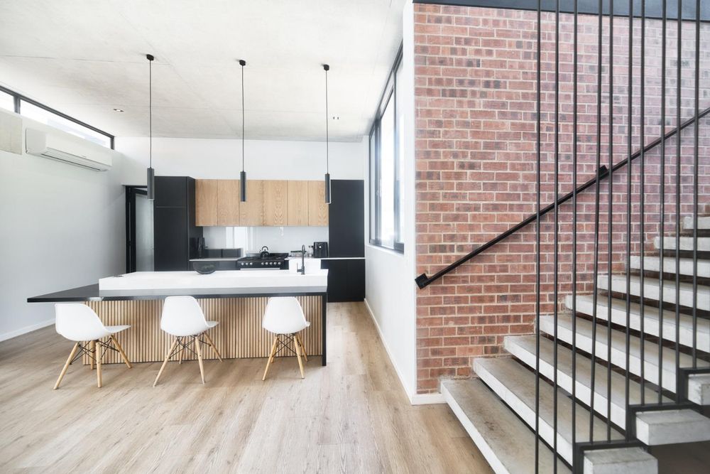 Walking in it feels like an open-plan sanctuary where exposed concrete ceilings and artfully placed brick accent walls create a distinctive aesthetic. The seamless flow between the lounge, dining area, and a contemporary kitchen, complete with a pantry and a stylish island, is enhanced by expansive sliding glass doors and windows. These special doors invite abundant natural light and effortlessly merge indoor luxury with the serene outdoor environment, perfect for entertaining or quiet contemplation.