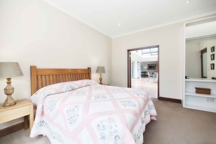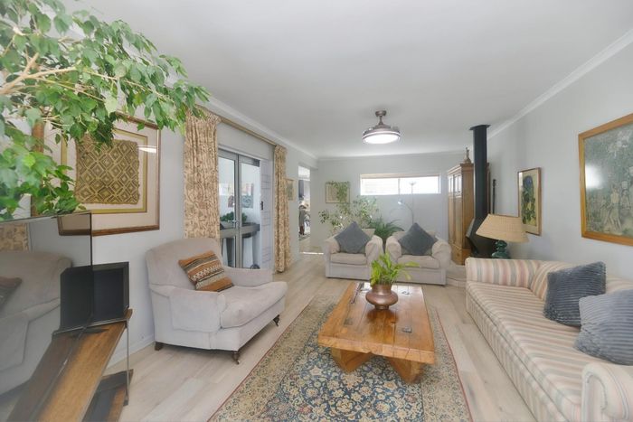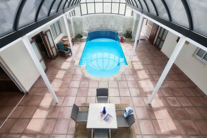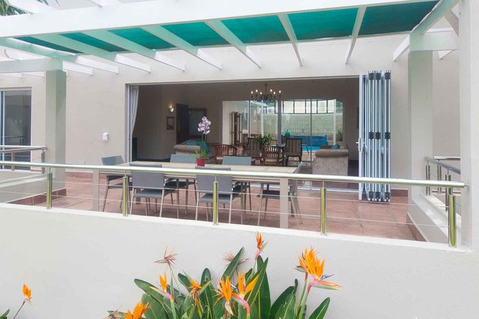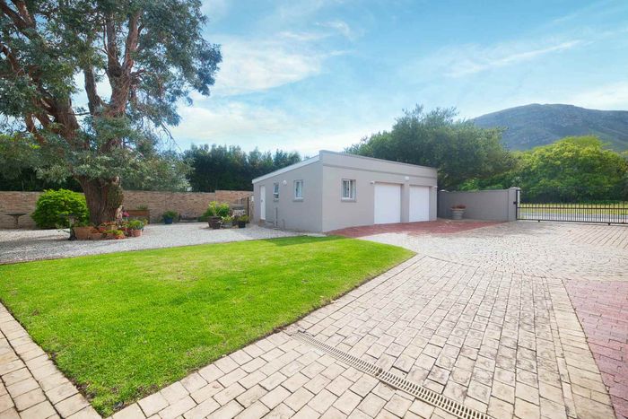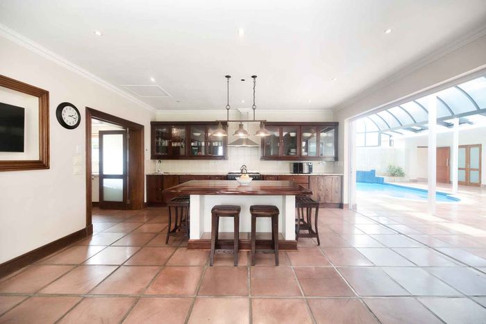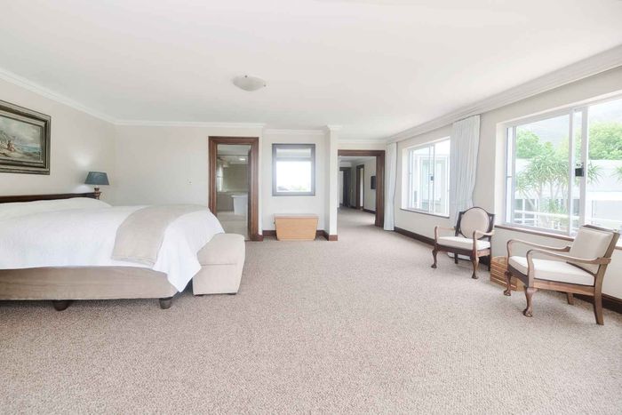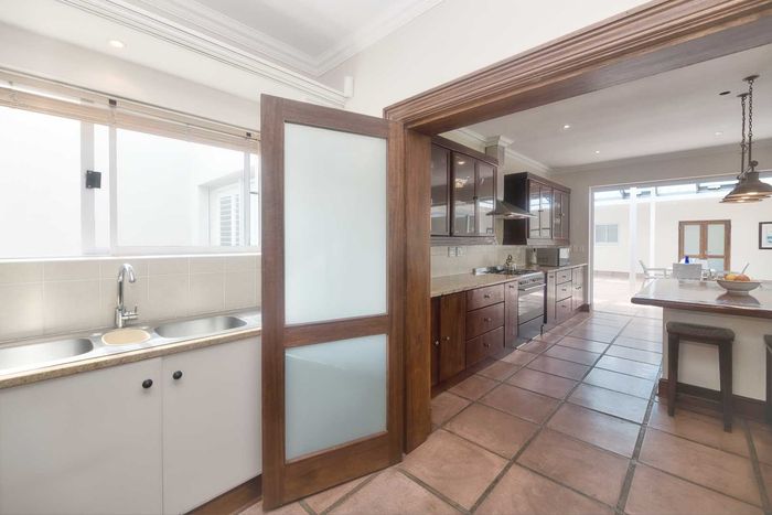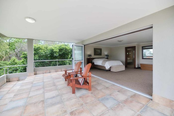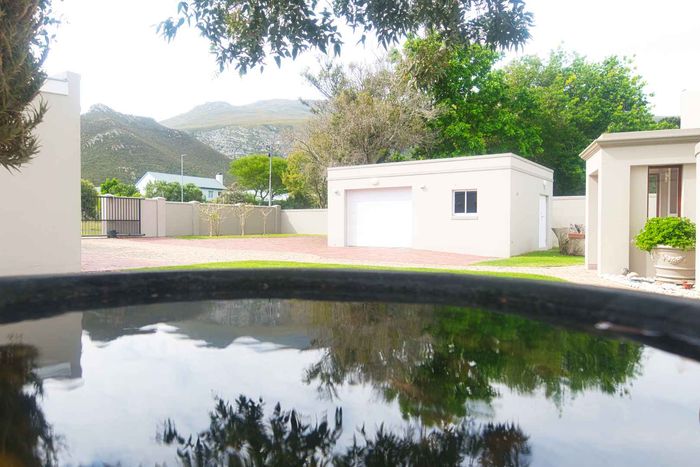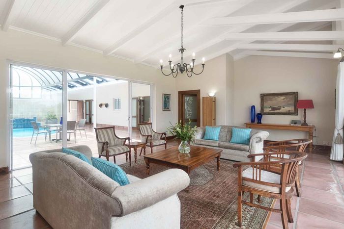 Entertainer's coastal estate in Hermanus, moments from whale-watching shores, set on private gardens with pool and terraces — five bedrooms, 5.5 baths and triple garage.
