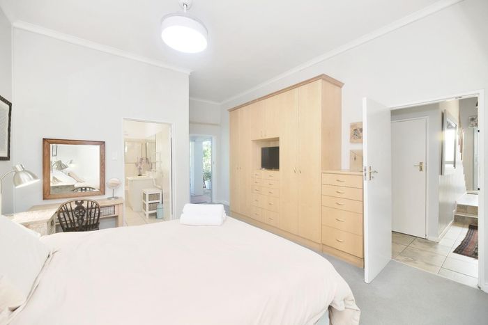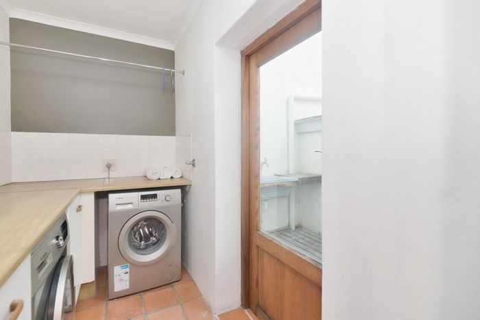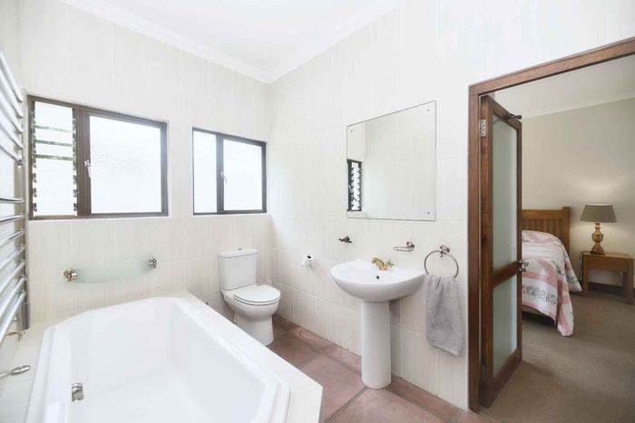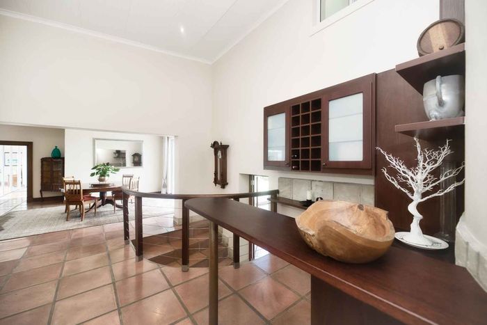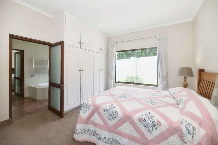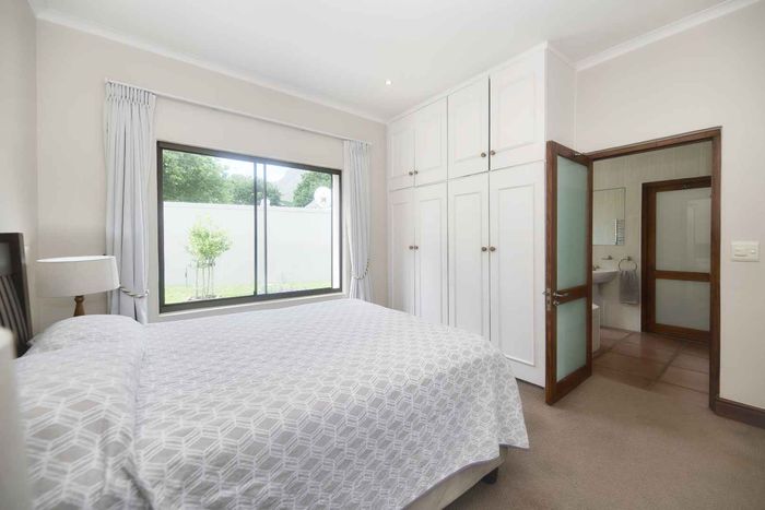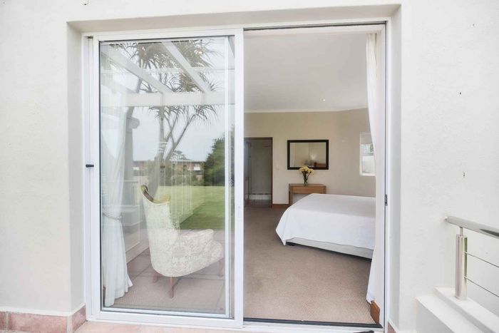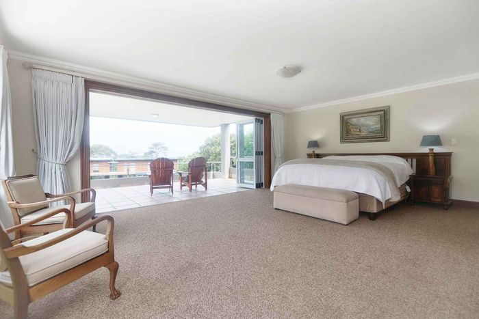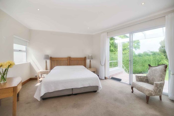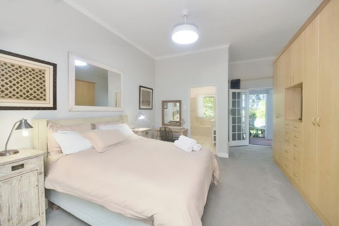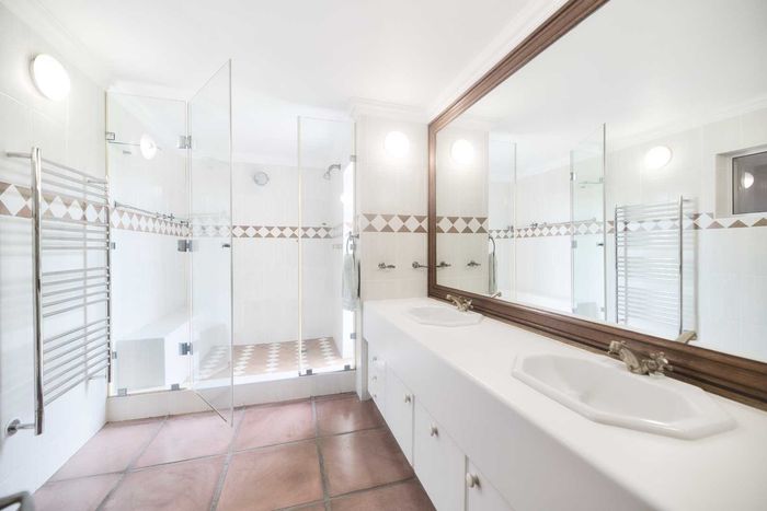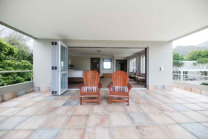 Entertainer's coastal estate in Hermanus, moments from whale-watching shores, set on private gardens with pool and terraces — five bedrooms, 5.5 baths and triple garage.