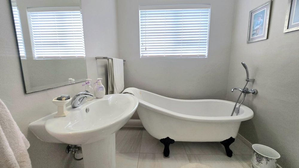 This exquisite double-storey house in Kleinbaai offers panoramic views of the golf course, distant sea, and majestic mountains. Ideal for both family living and as a holiday retreat, this property boasts four bedrooms split across two levels. The main bedroom features an en suite bathroom and a walk-in closet.