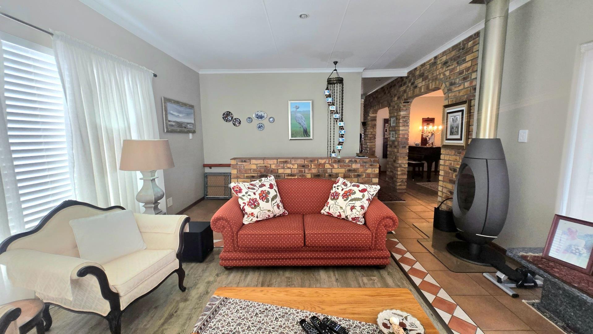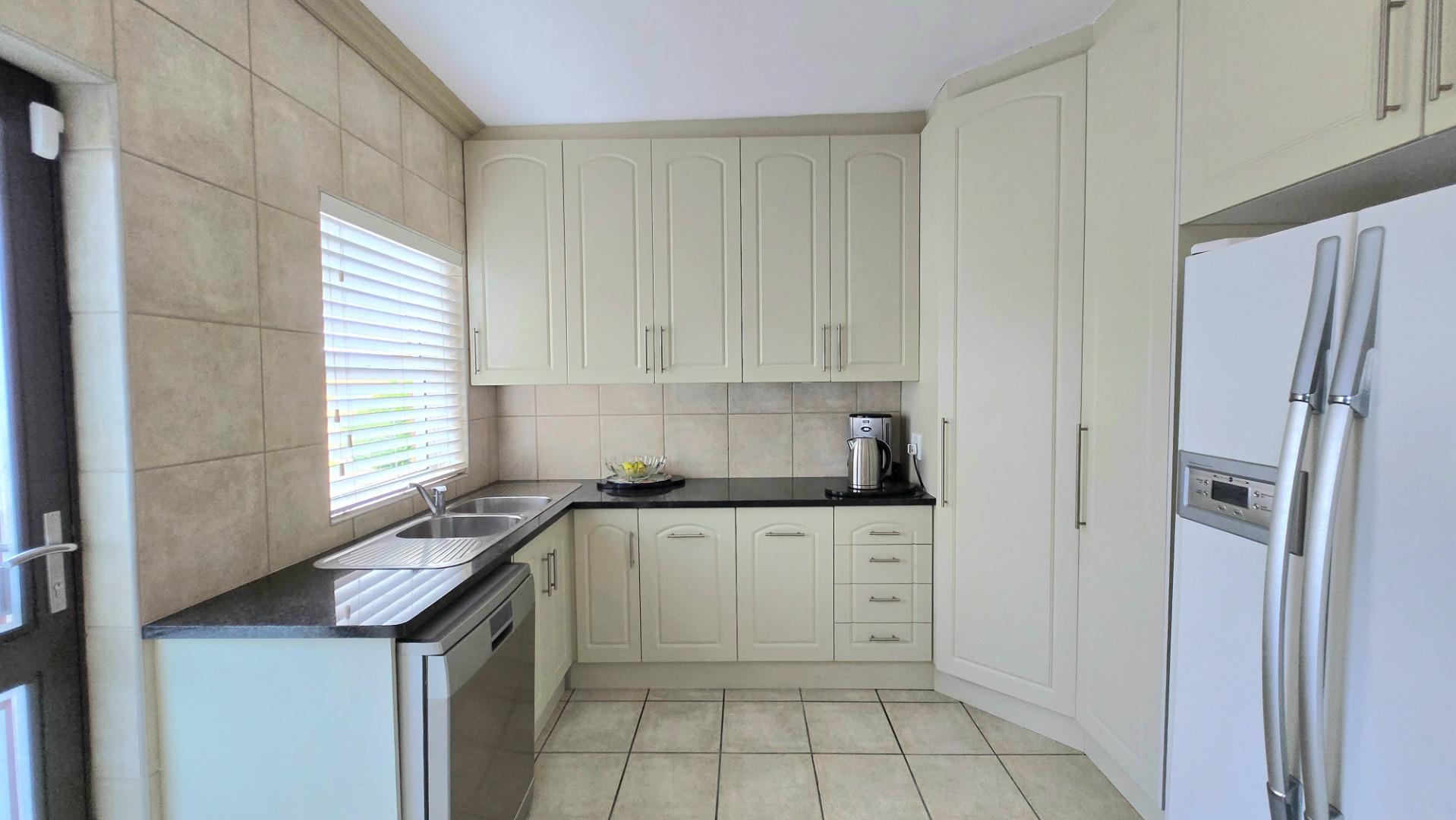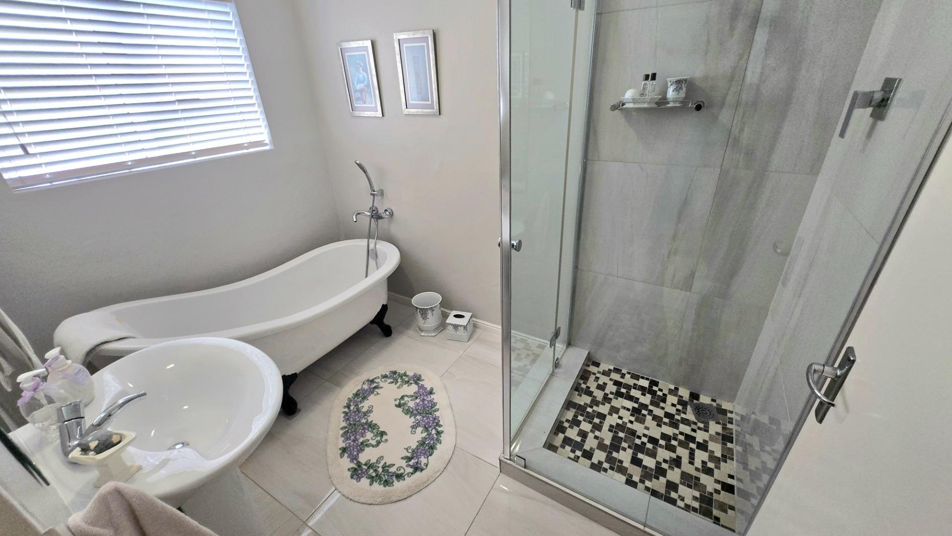 The home is designed for comfort and style, with a spectacular main kitchen that includes ample cupboard space, a scullery, and a pantry. The large open-plan living and dining room opens onto an enclosed balcony with a built-in braai, providing a perfect space to enjoy the amazing views.