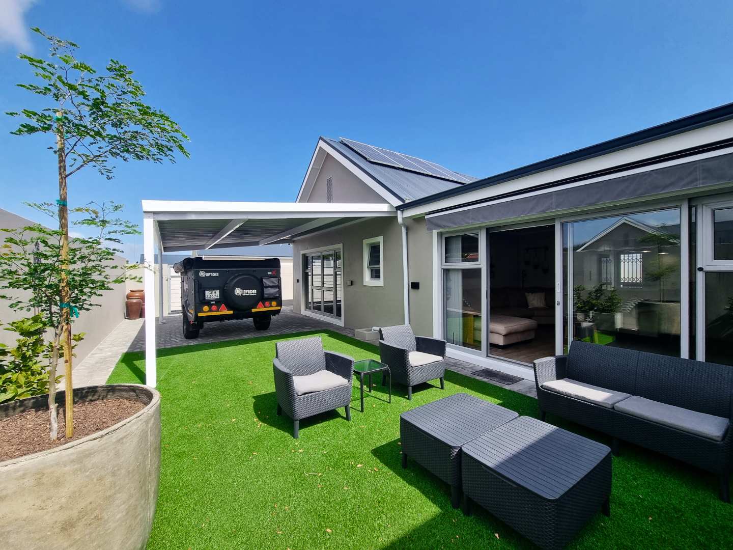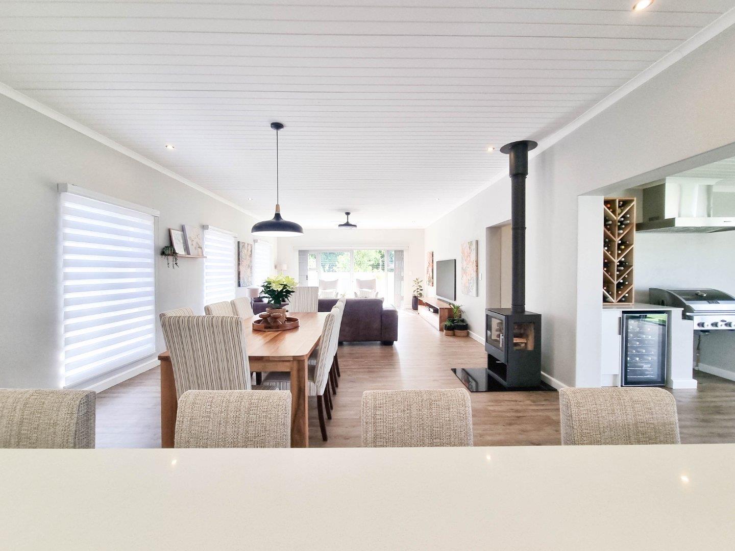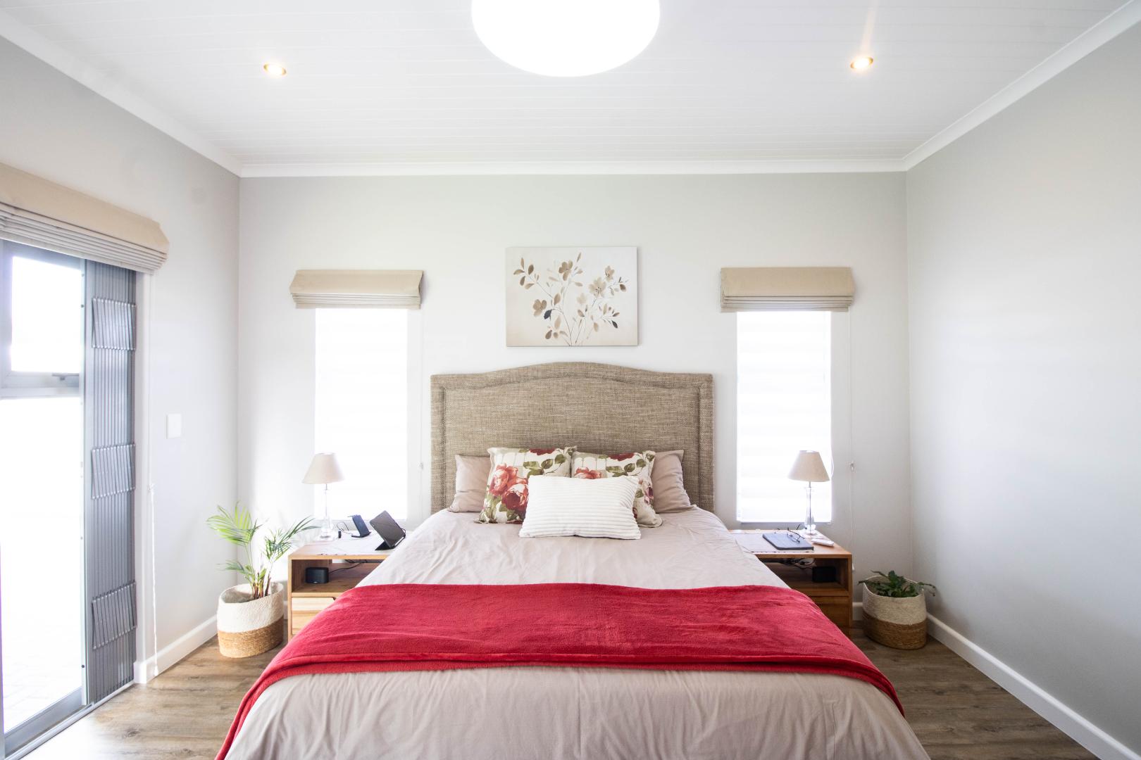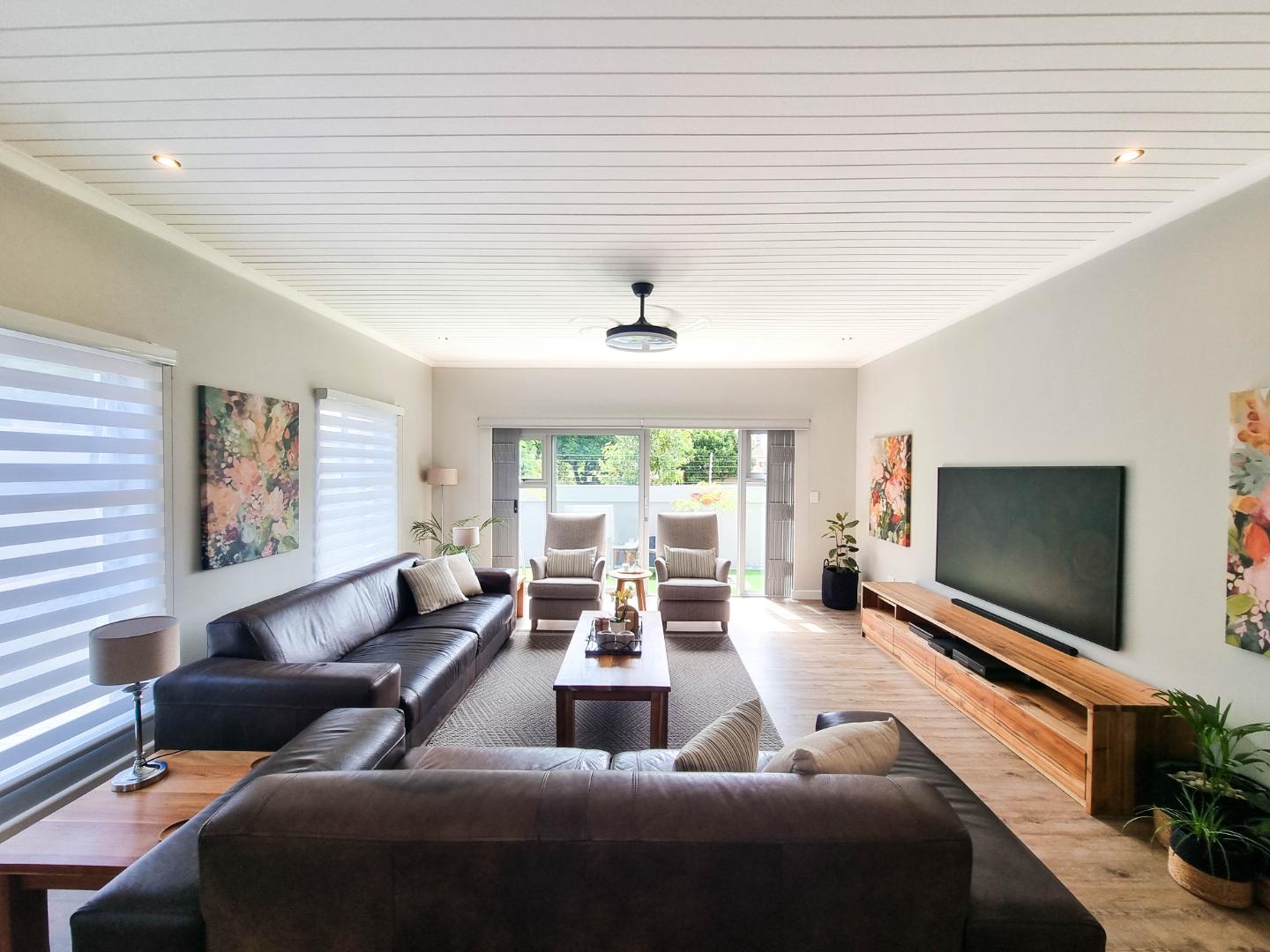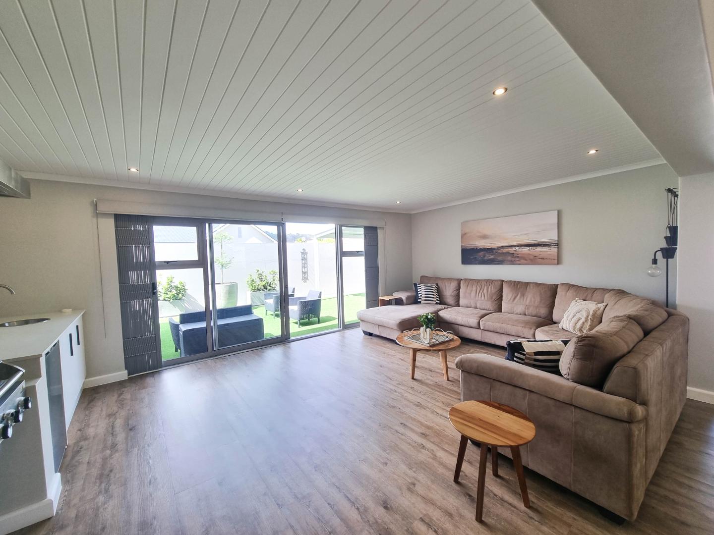 The heart of this home is its sun-drenched open-plan living area, where the kitchen, dining room, family room, and braai room flow seamlessly into one another. Both lounges open onto the garden through expansive glass doors, creating that effortless indoor-outdoor lifestyle that makes coastal living so special. Step outside to your covered patio with a convenient fold-away awning, the perfect setting for alfresco dining and relaxed gatherings with ocean breezes in the air.