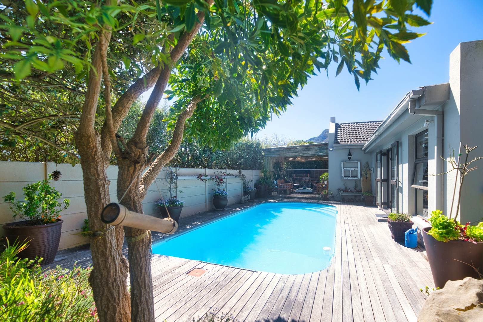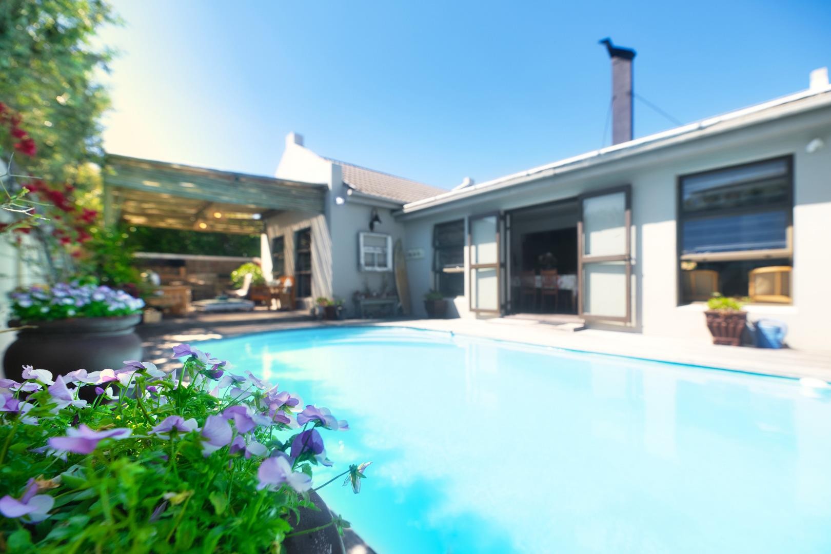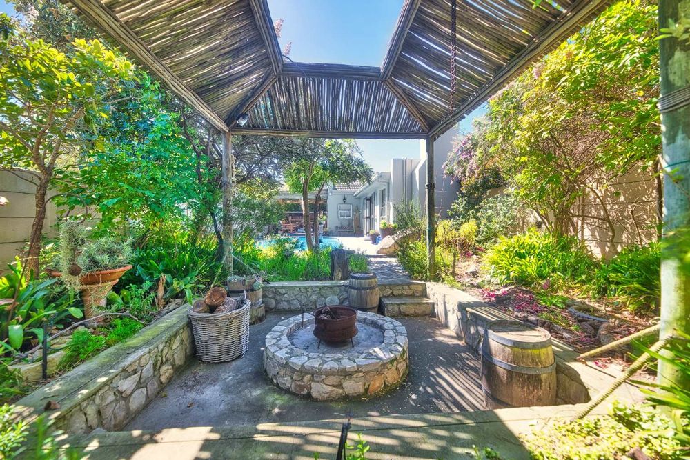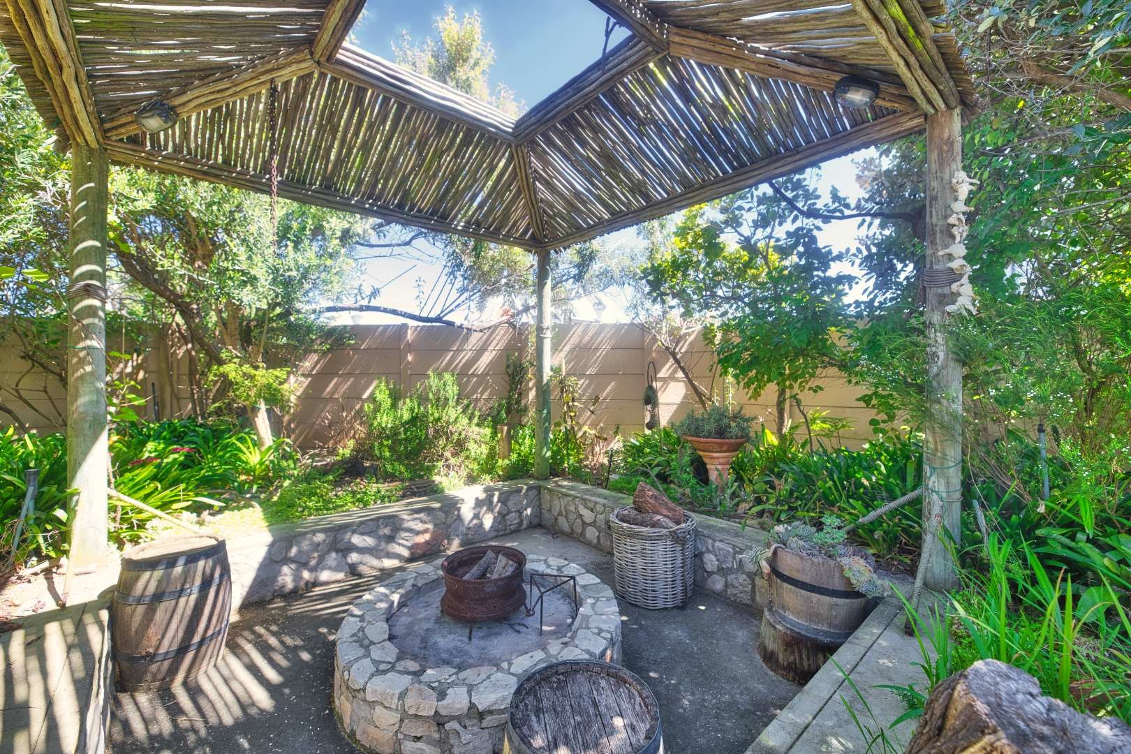 The outdoor spaces show thoughtful design. A sparkling pool with wraparound wooden decking forms the centerpiece of the garden, complemented by a sheltered braai area perfect for entertaining and a serene stone fire pit nestled among lush greenery. This is where Vermont's natural beauty becomes your daily backdrop—a seamless extension of your living space beneath the open sky.