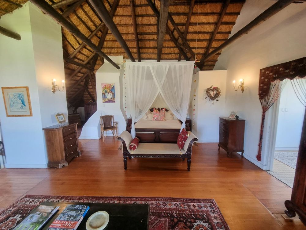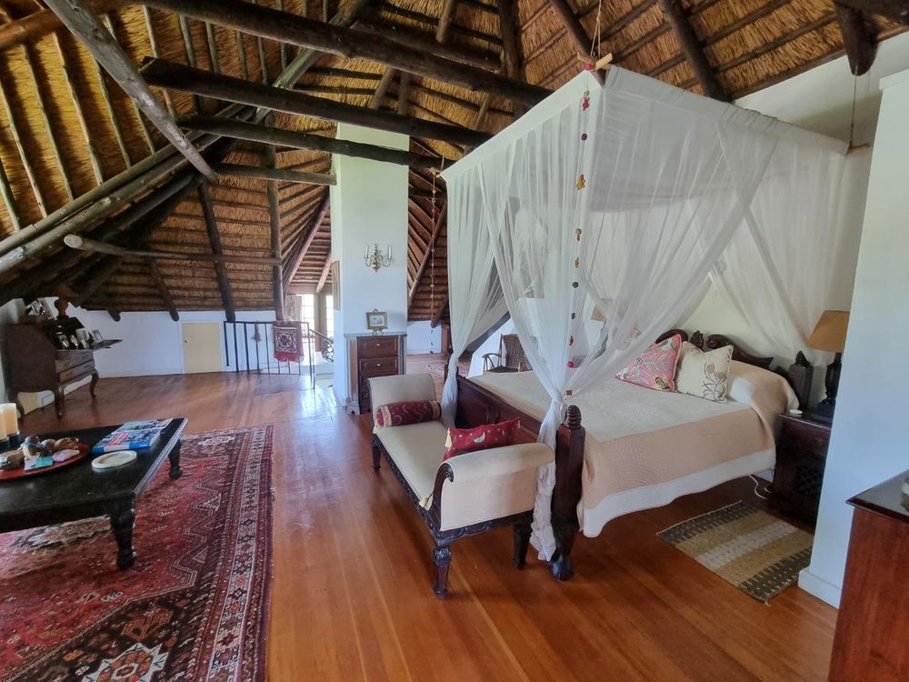 The home features three comfortable bedrooms, each designed for a peaceful retreat. Three of these bedrooms come with their own en-suite bathrooms, plus there's a convenient guest toilet, making it a 4.5-bathroom setup. You'll love the unique touch of exposed wooden beams and thatched ceilings in the bedrooms, adding to the home's rustic charm. The kitchen is well-equipped with a scullery and pantry, making meal prep a breeze.